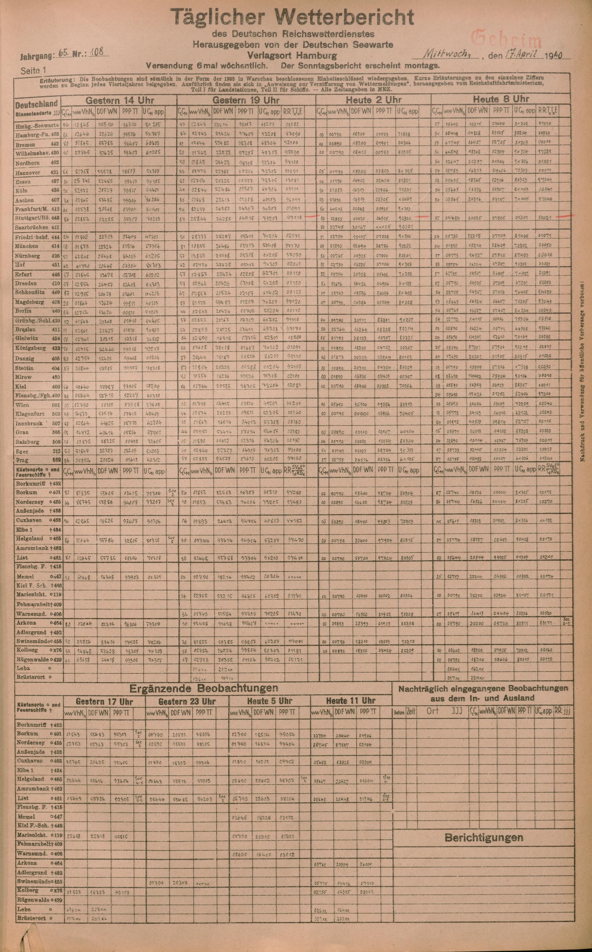 Täglicher Wetterbericht des deutschen Reichswetterdienstes