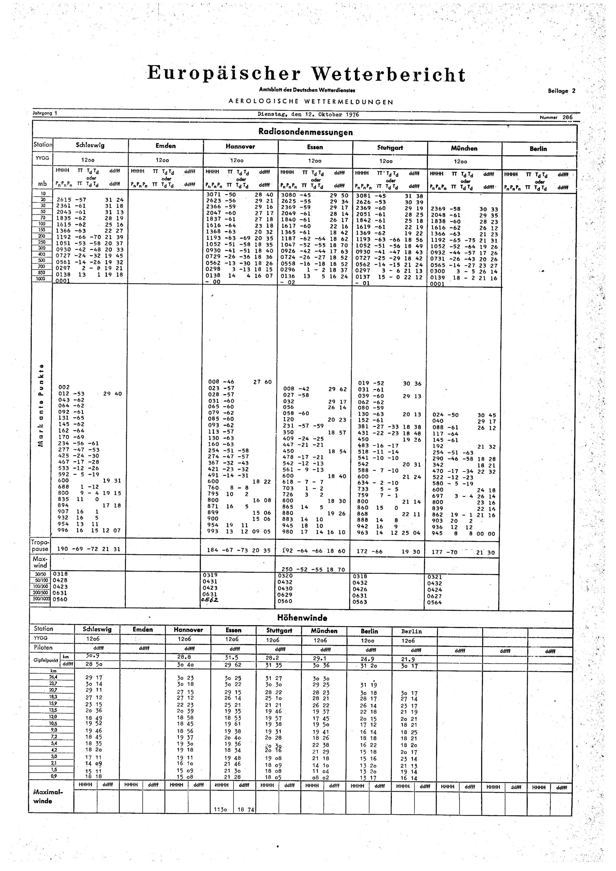 Europäischer Wetterbericht. Beilage 1, Bodenwettermeldungen. 1976-1994