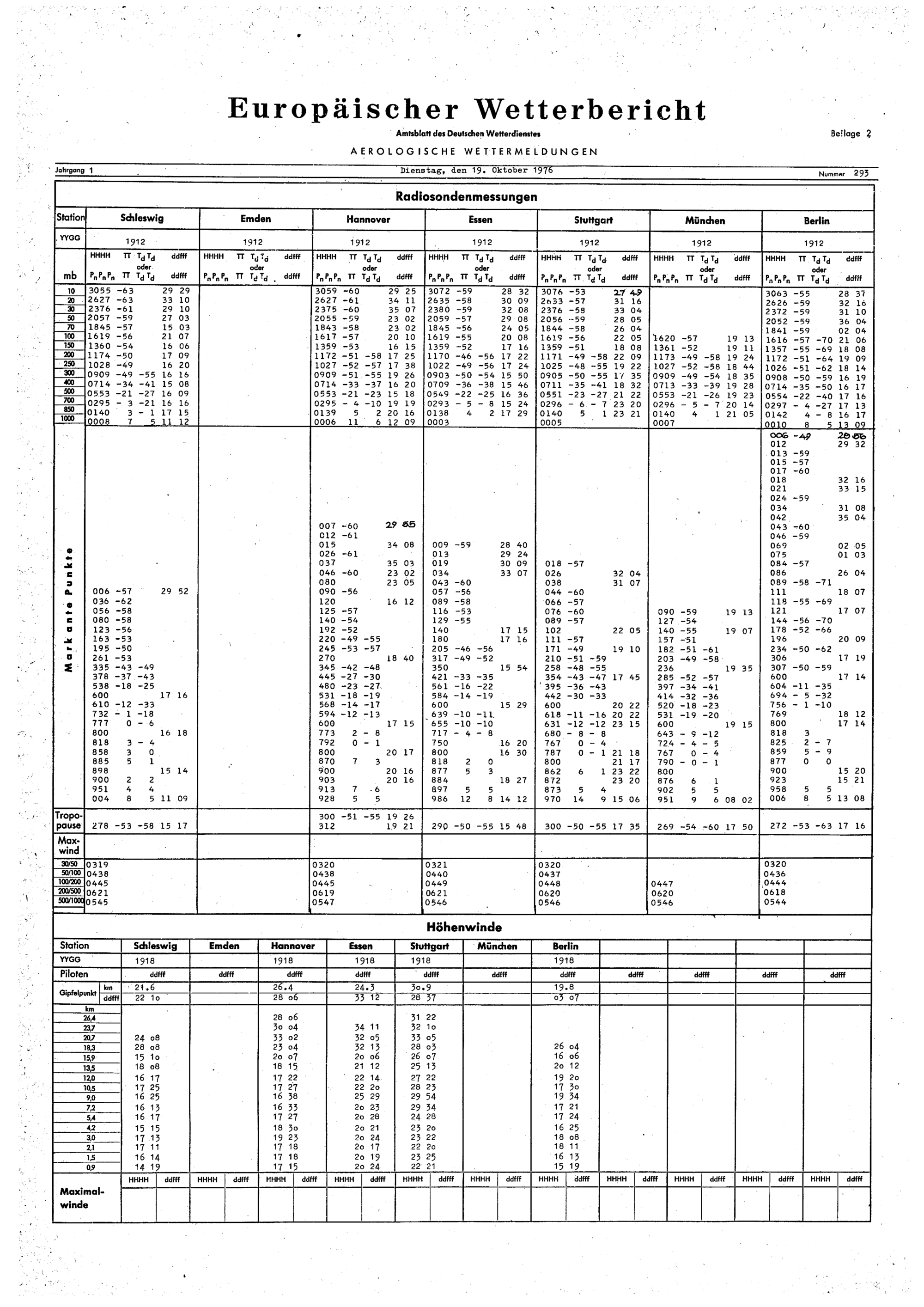 Europäischer Wetterbericht. Beilage 1, Bodenwettermeldungen. 1976-1994