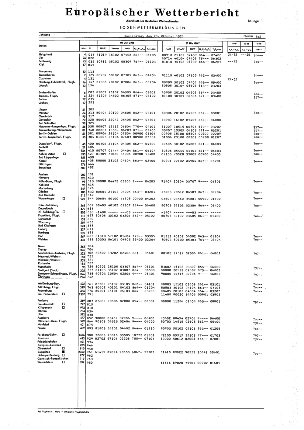 Europäischer Wetterbericht. Beilage 1, Bodenwettermeldungen. 1976-1994