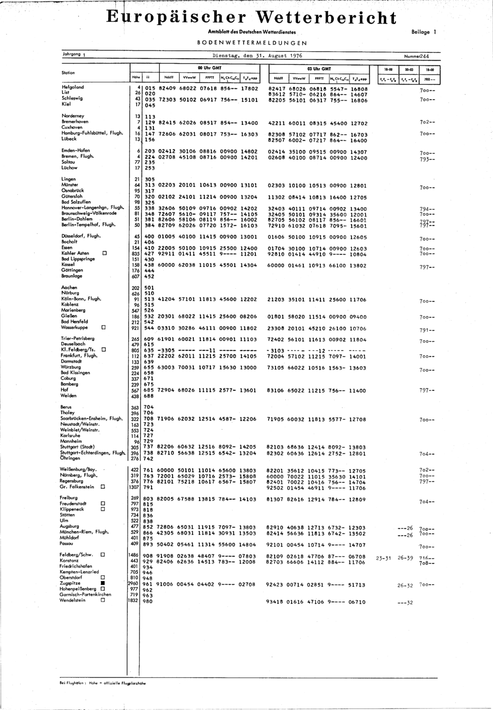 Europäischer Wetterbericht. Beilage 1, Bodenwettermeldungen. 1976-1994