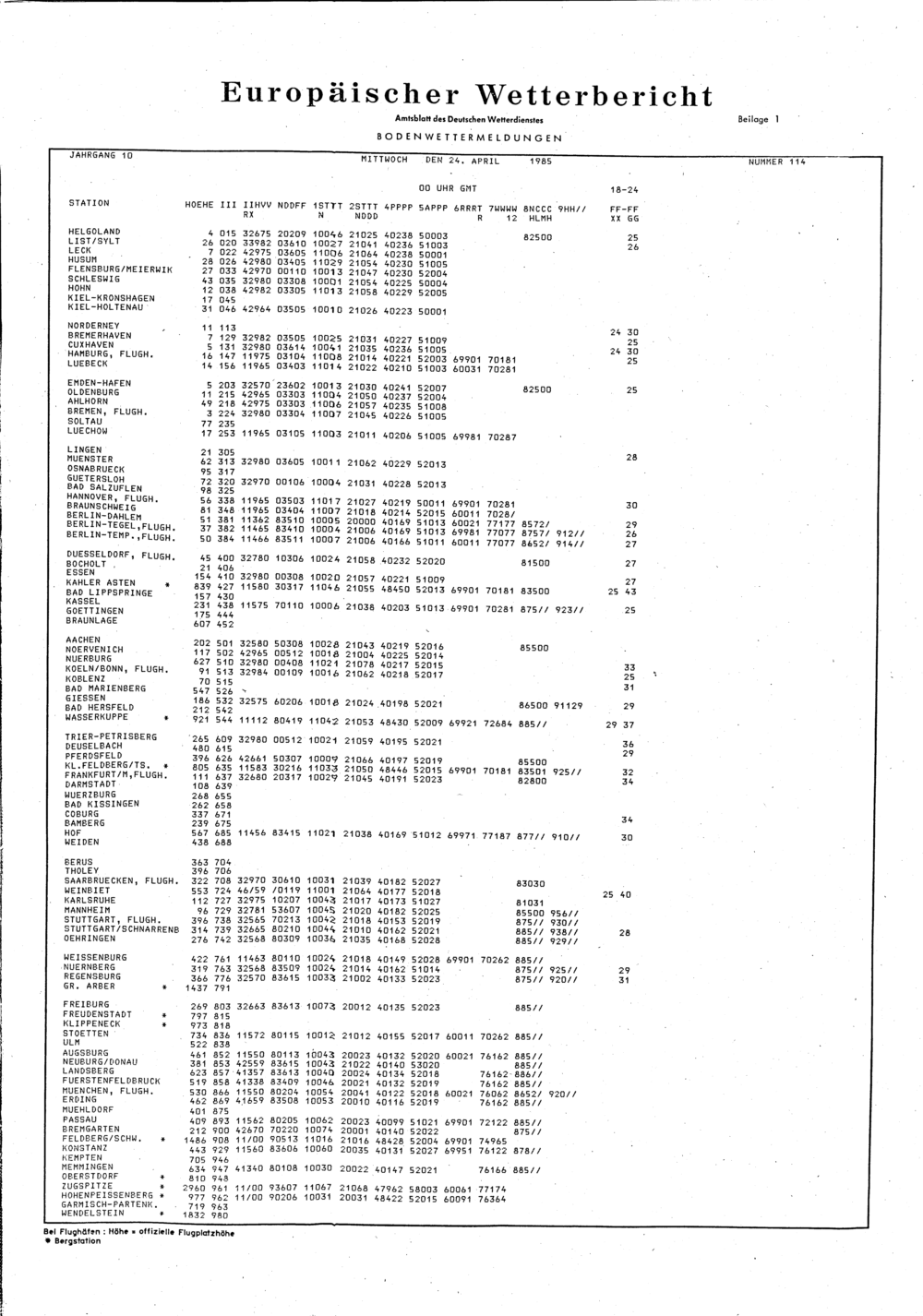Europäischer Wetterbericht. Beilage 1, Bodenwettermeldungen. 1976-1994