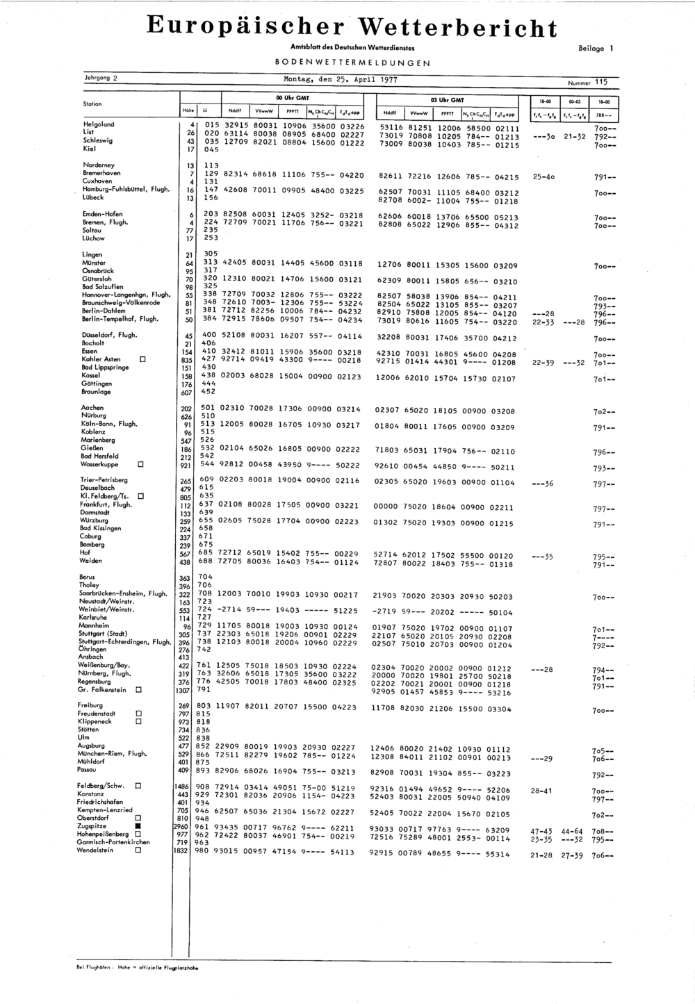 Europäischer Wetterbericht. Beilage 1, Bodenwettermeldungen. 1976-1994