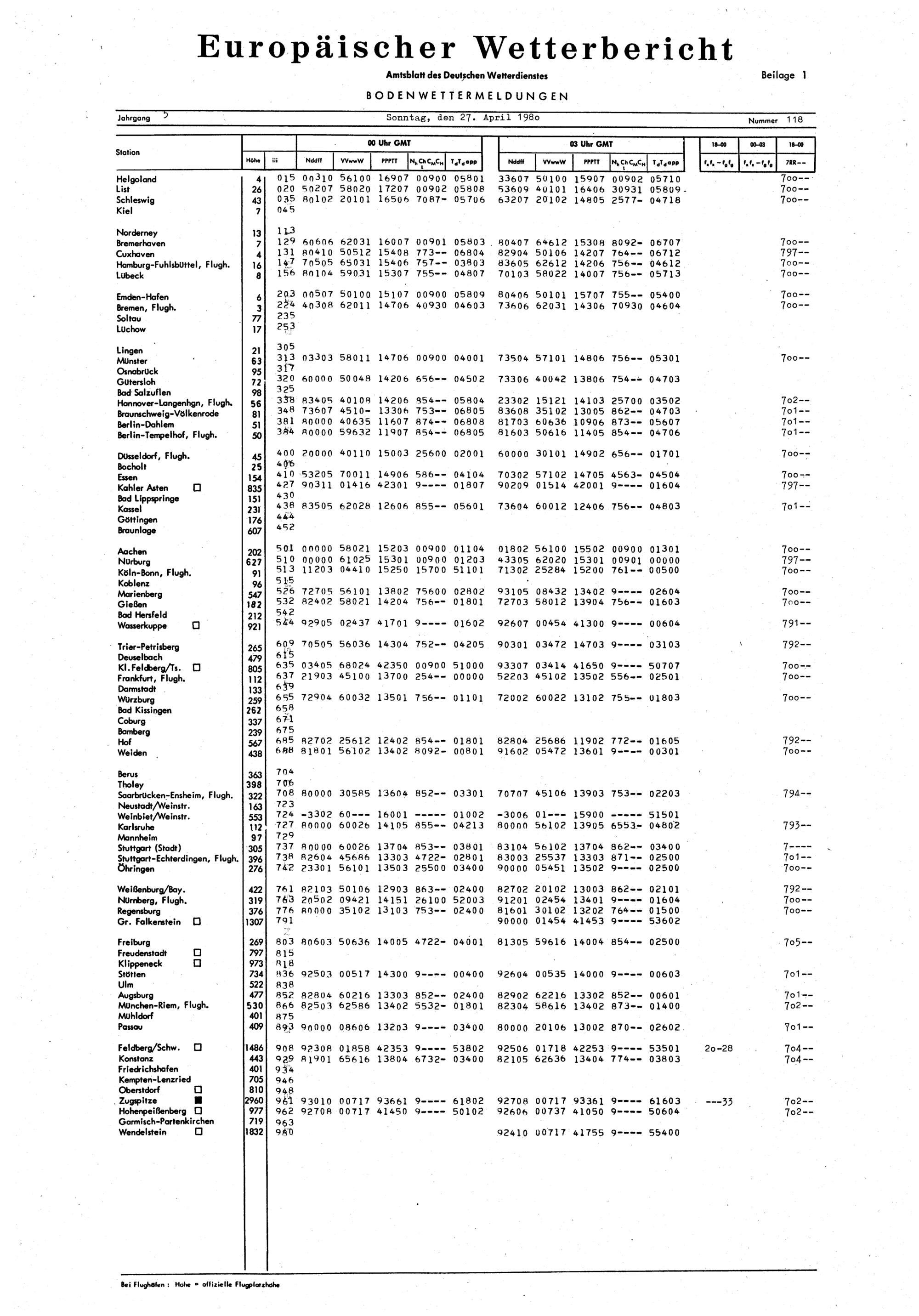 Europäischer Wetterbericht. Beilage 1, Bodenwettermeldungen. 1976-1994