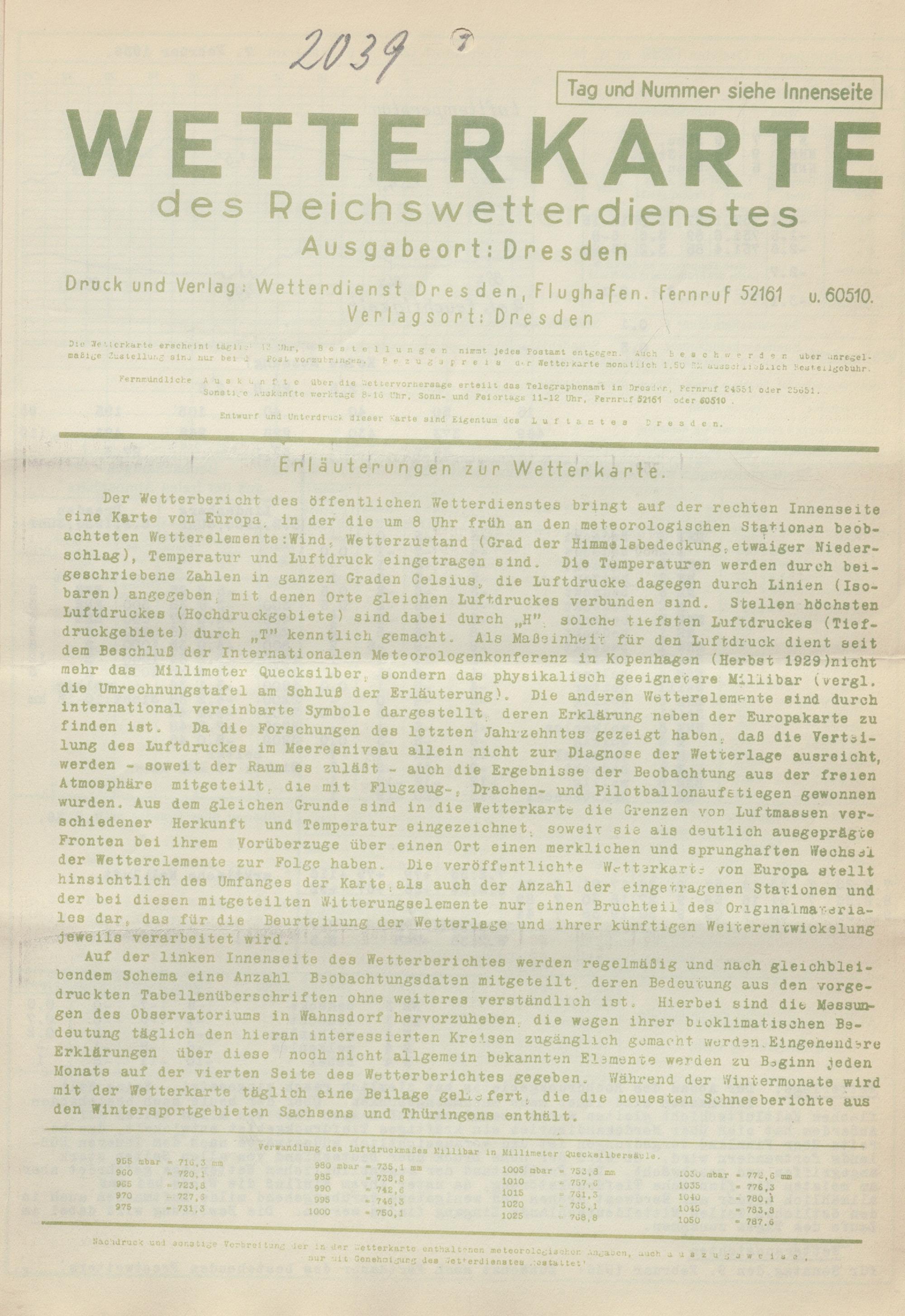 Wetterkarte des Reichswetterdienstes