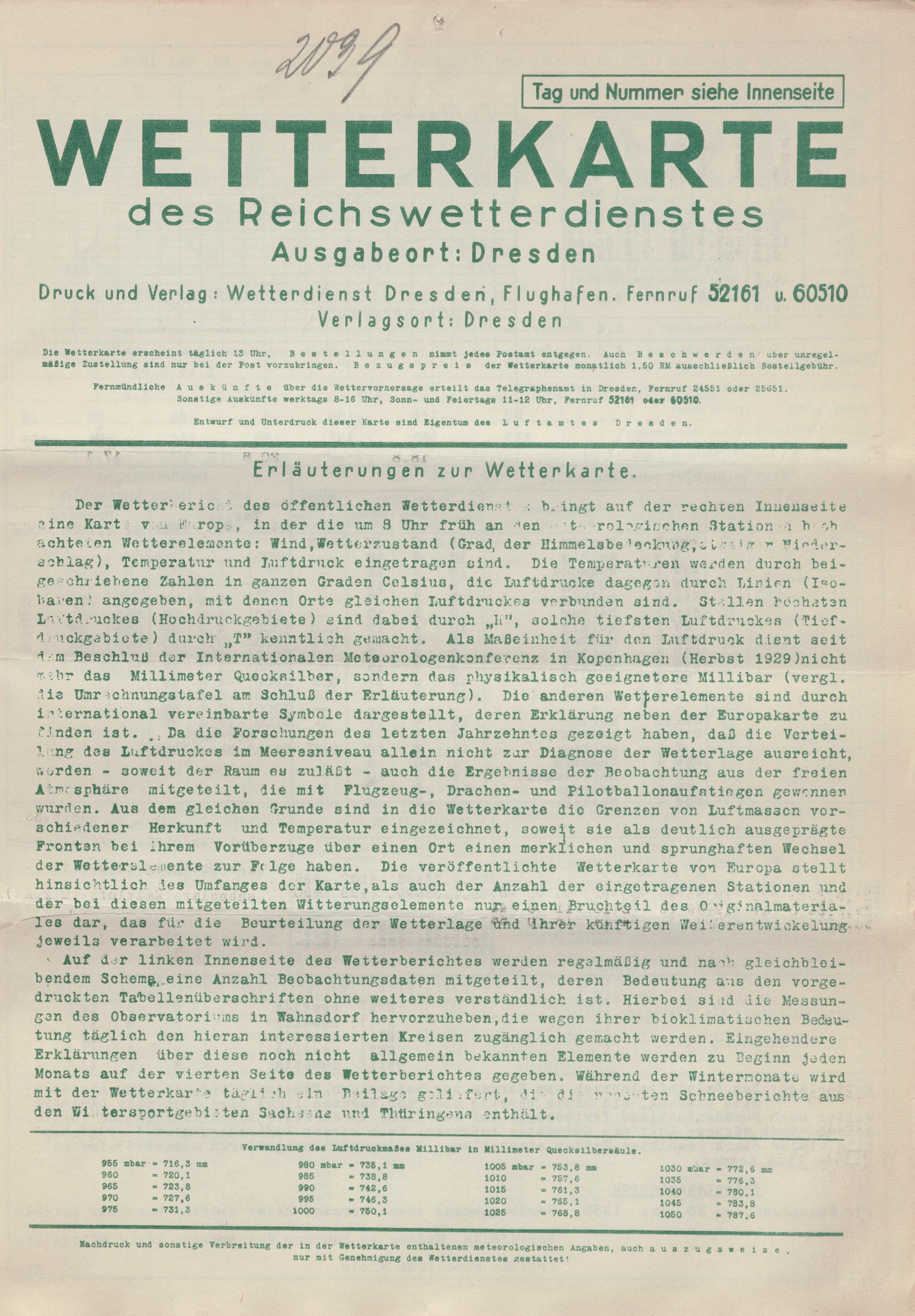 Wetterkarte des Reichswetterdienstes