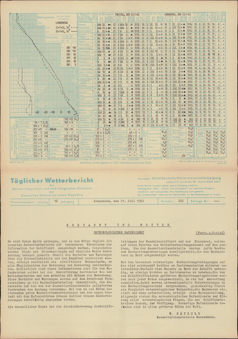 Täglicher Wetterbericht des Meteorologischen und Hydrologischen Dienstes der Deutschen...