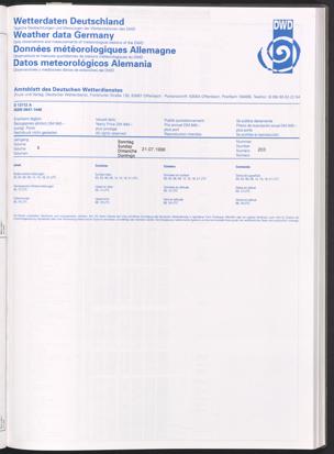Zum Zitieren der Quelle finden Sie folgend die empfohlene Quellenangabe. - QuellenangabeWetterdaten Deutschland : tägliche Beobachtungen und Messungen der Wetterstationen des DWD ; Amtsblatt des Deutschen Wetterdienstes = Weather data Germany : daily observations and [...]. Offenbach : DWD, 1.1995 - 4.1998; damit Ersch. eingest., 1995-1998 : Jg. 2 (21.7.1996) H. Juli. Daten. / CC-BY-Lizenz (4.0)