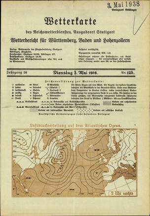 Wetterkarte des Reichswetterdienstes. Böblingen : Wetterwarte d. Flughafenleitung, 1935,8.Febr. - 1936; 57.1937 - 59.1939,90(31.3), 1935-1939 : Jg. 58 (3.5.1938) H. 123. / Gemeinfrei