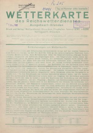 Ausgabeort Dresden.Wetterkarte des Reichswetterdienstes. Dresden : Wetterwarte d. Flughafenleitung Dresden-Klotzsche, 1935,27 - 1939,243; damit Ersch. eingest., 1935-1939. / CC-BY-Lizenz (4.0)