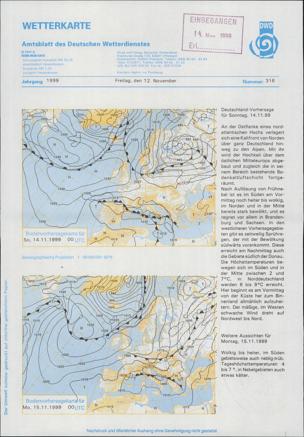 Wetterkarte : Amtsblatt d. Deutschen Wetterdienstes. Offenbach, M. : Dt. Wetterdienst, Zentralamt, 1990 - 2001,1(1.Jan.), 1990-2001 : (12.11.1999) H. November. / CC-BY-Lizenz (4.0)