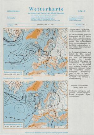 Zum Zitieren der Quelle finden Sie folgend die empfohlene Quellenangabe. - QuellenangabeWetterkarte : Amtsblatt d. Deutschen Wetterdienstes. Offenbach, M. : Dt. Wetterdienst, Zentralamt, 1990 - 2001,1(1.Jan.), 1990-2001 : (1993) H. Juni. / CC-BY-Lizenz (4.0)