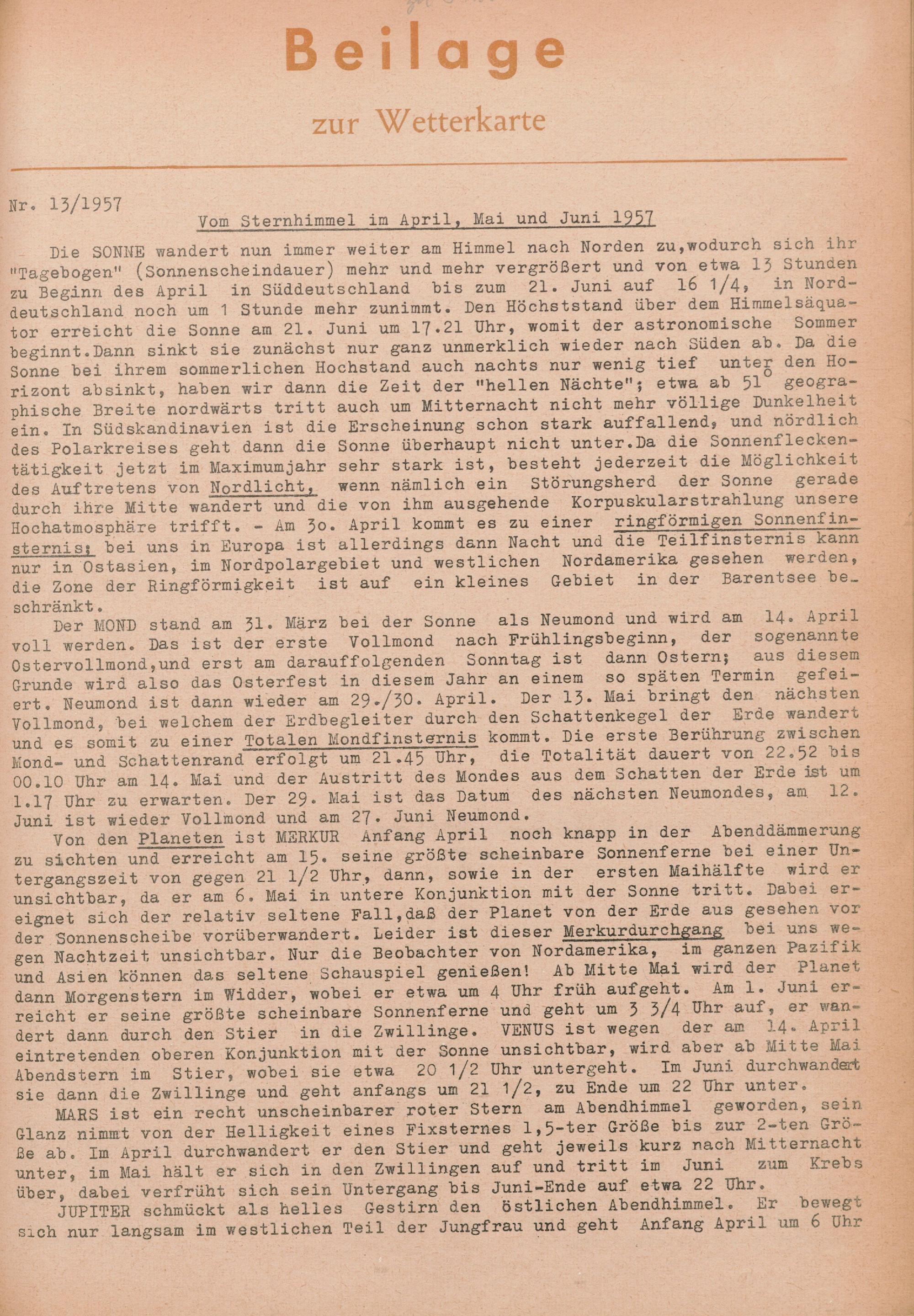 13. Vom Sternenhimmel im April, Mai und Juni 1957