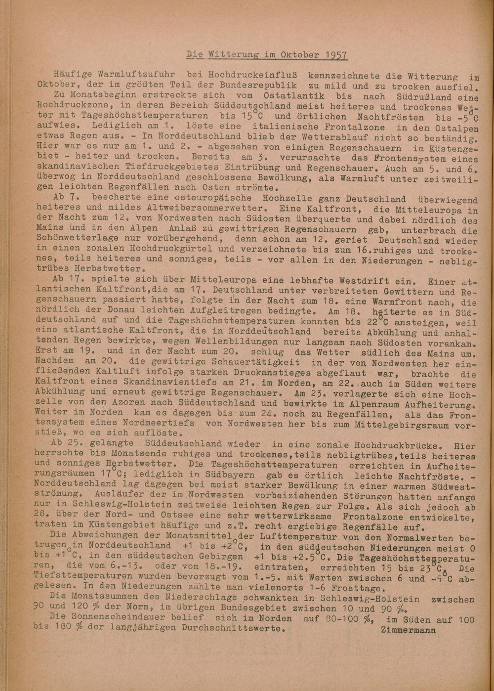 46. Niederschlag und Lufttemperatur Monat Oktober 1957