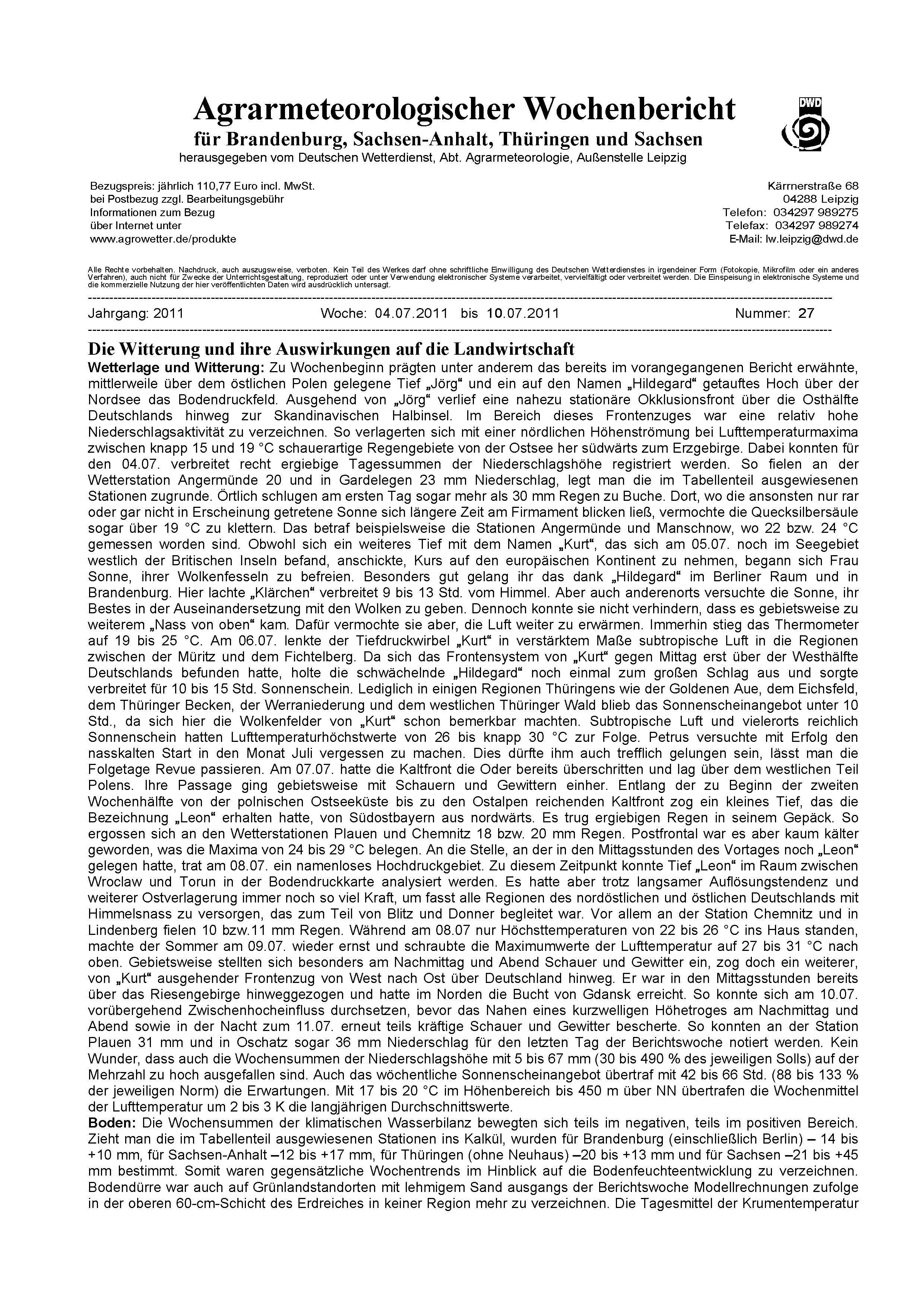 Agrarmeteorologischer Wochenbericht für Sachsen, Sachsen-Anhalt, Thüringen und B...