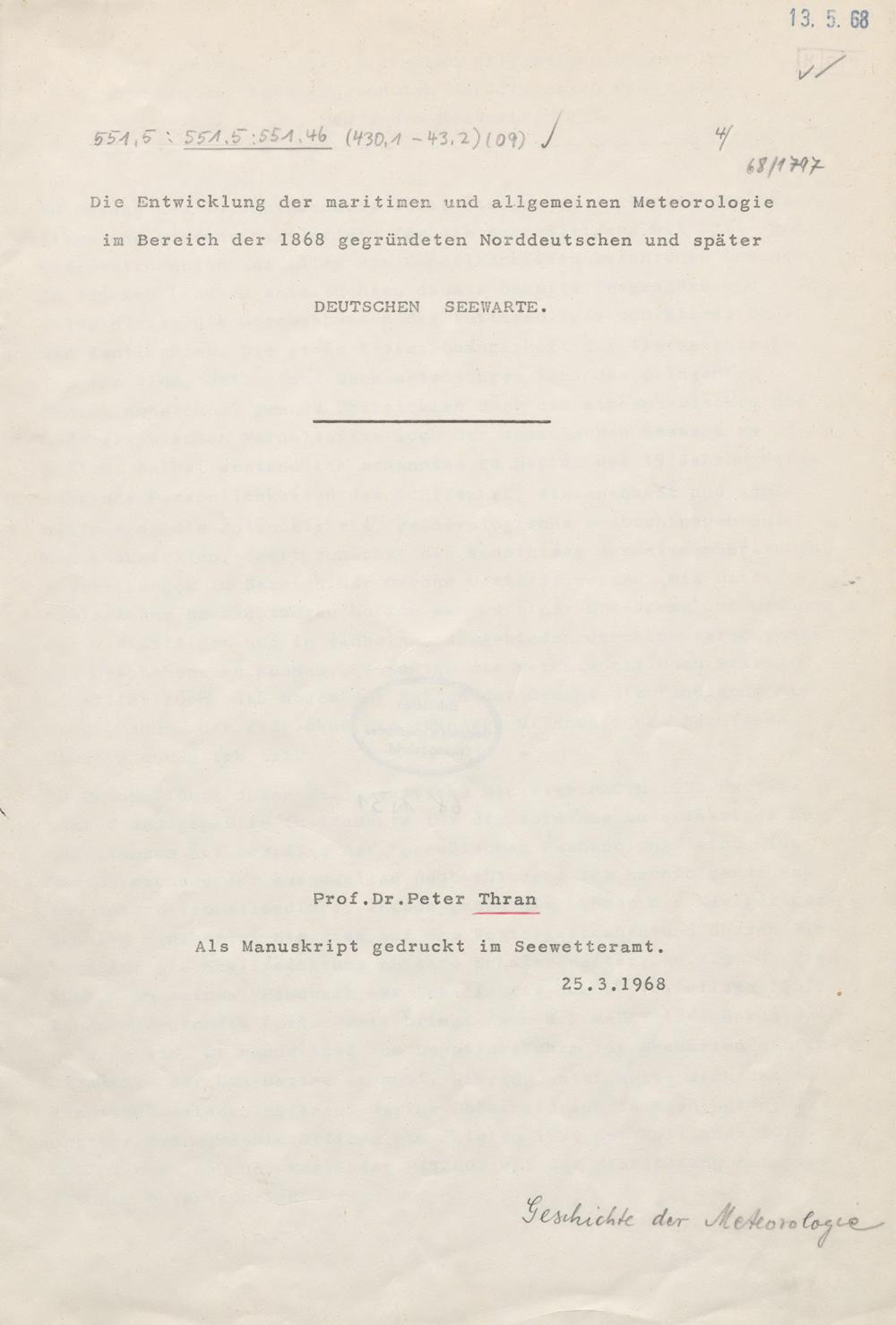 Die Entwicklung der maritimen und allgemeinen Meteorologie im Bereich der 1868 gegründeten...