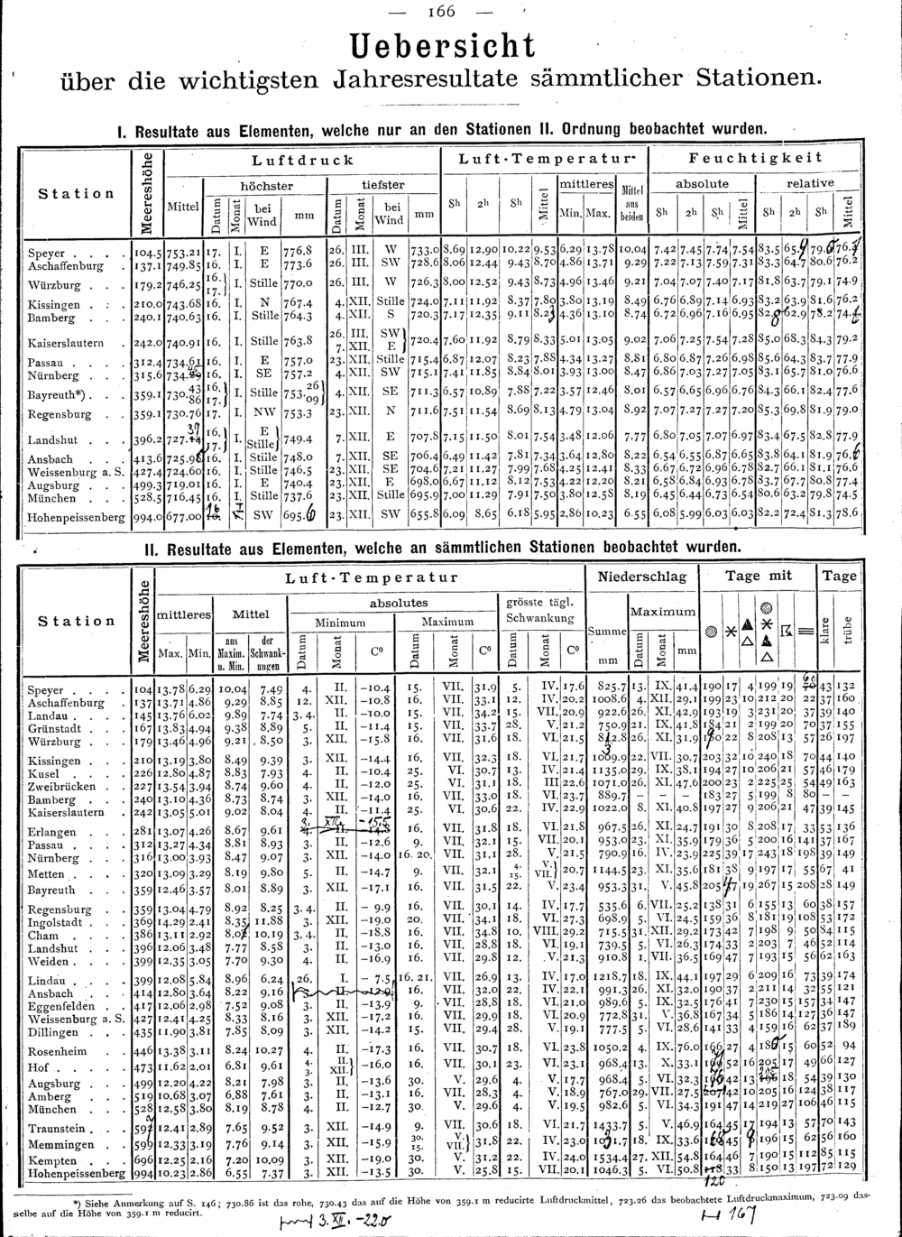 Uebersicht über die wichtigsten Jahresresultate sämmtlicher Stationen