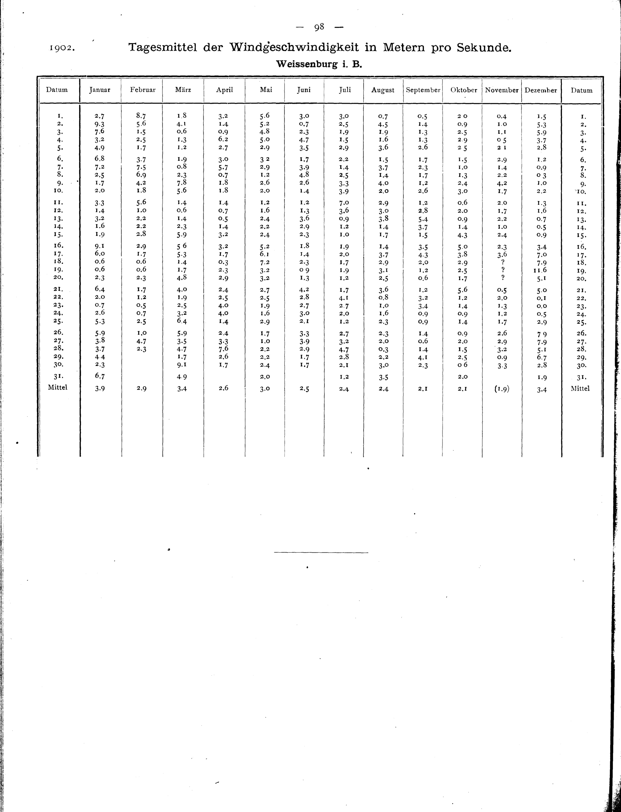 Tagesmittel der Windgeschwindigkeiten in Metern pro Secunde