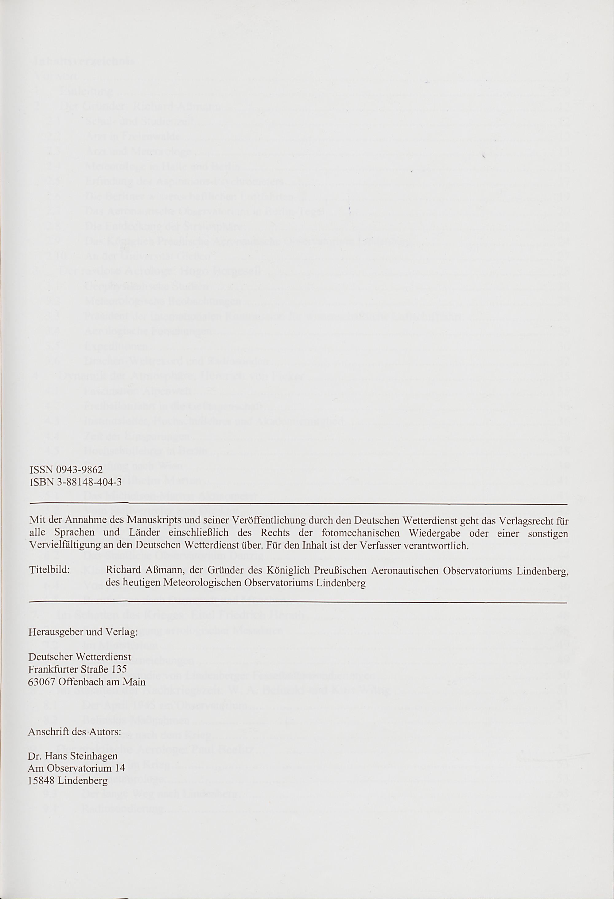 Biografien der Leiter des Meteorologischen Observatoriums Lindenberg von 1905 bis 2005 / von Hans Steinhagen