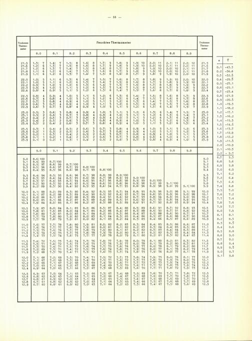 Tafeln zur Bestimmung des Sättigungsdefizits aus Temperatur und relativer Feuchtigkeit