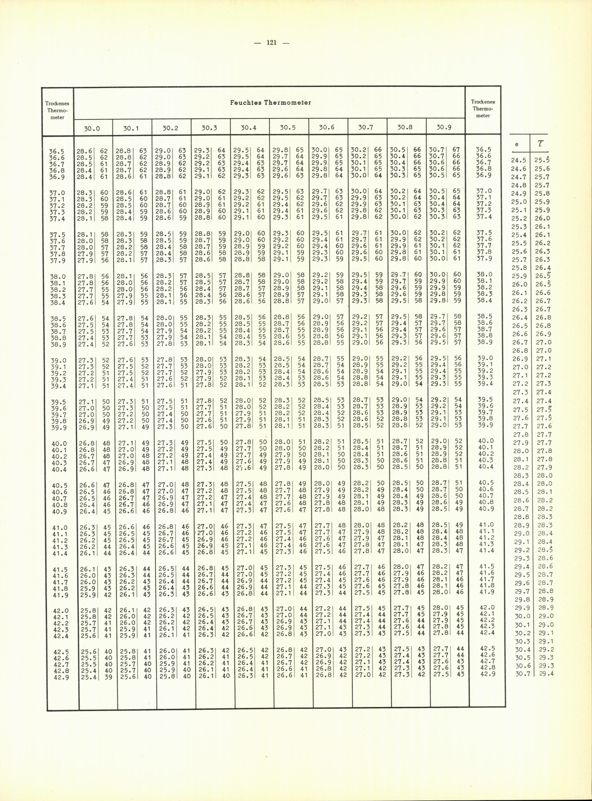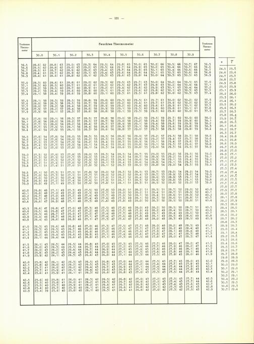 Ausführliche Tafeln für Dampfdruck und relative Feuchtigkeit, gültig für den Luftdruck...