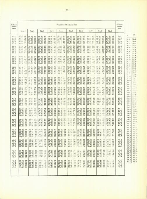 Ausführliche Tafeln für Dampfdruck und relative Feuchtigkeit, gültig für den Luftdruck...