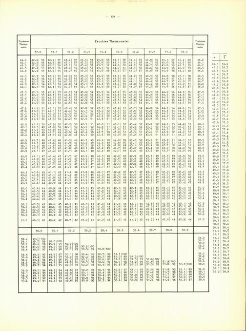 Ausführliche Tafeln für Dampfdruck und relative Feuchtigkeit, gültig für den Luftdruck...