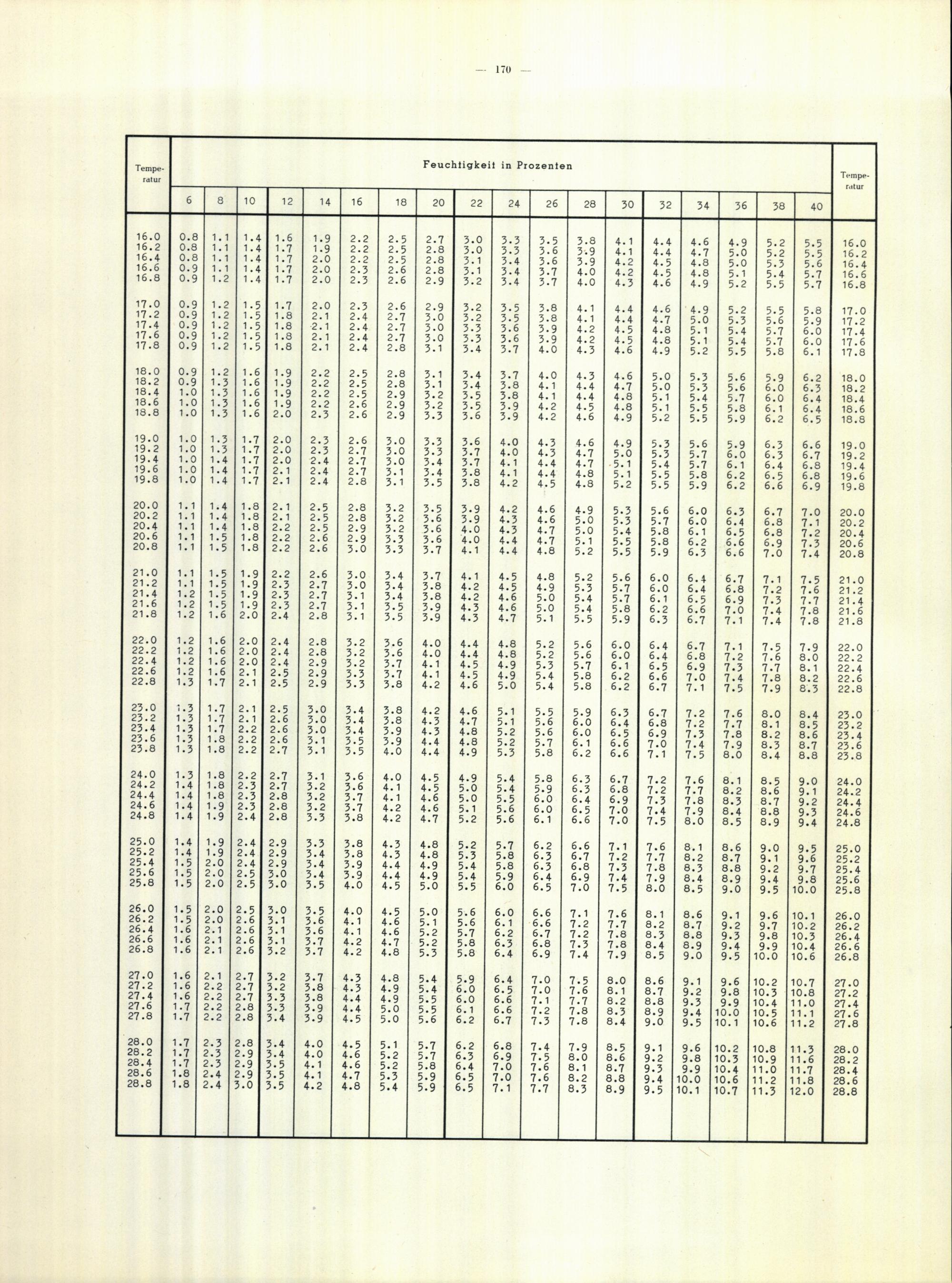 Tafeln zur Bestimmung des Sättigungsdefizits aus Temperatur und relativer Feuchtigkeit