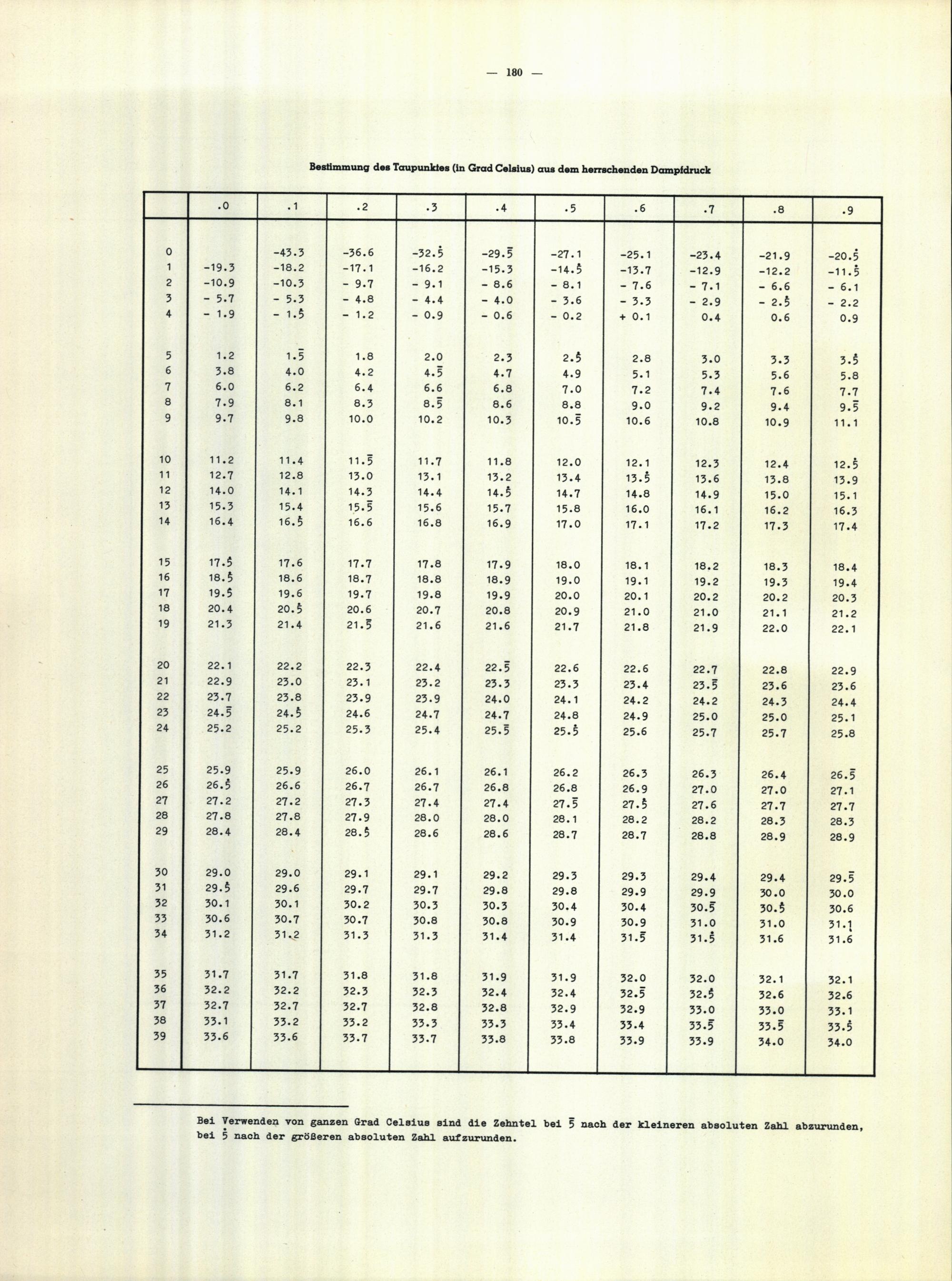 Tafeln zur Bestimmung des Taupunktes aus dem herrschenden Dampfdruck