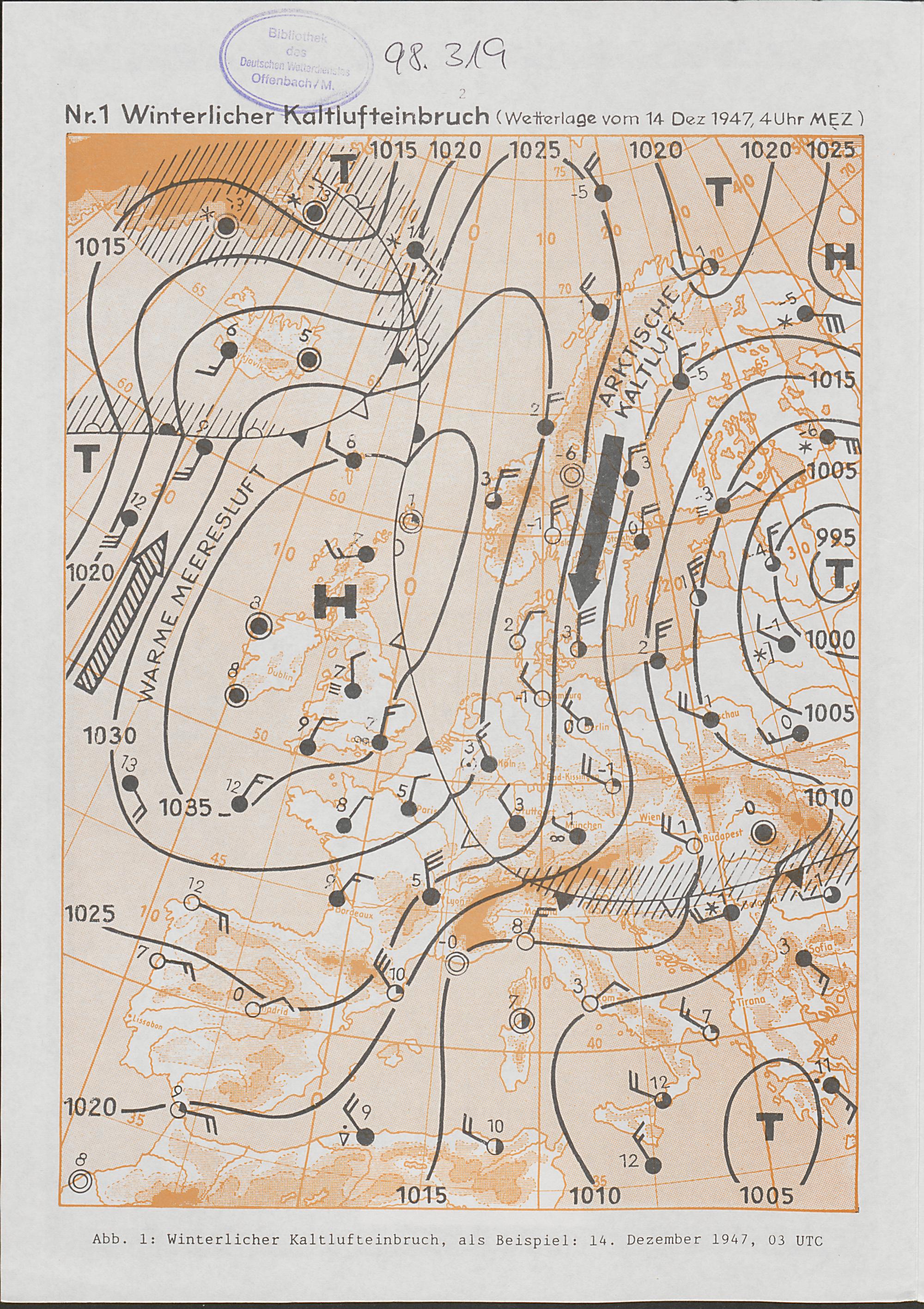 Übungswetterkarte Nr. 1: winterlicher Kaltlufteinbruch : Wetterlage vom 14. Dezember 1947 mit Erläuterungen