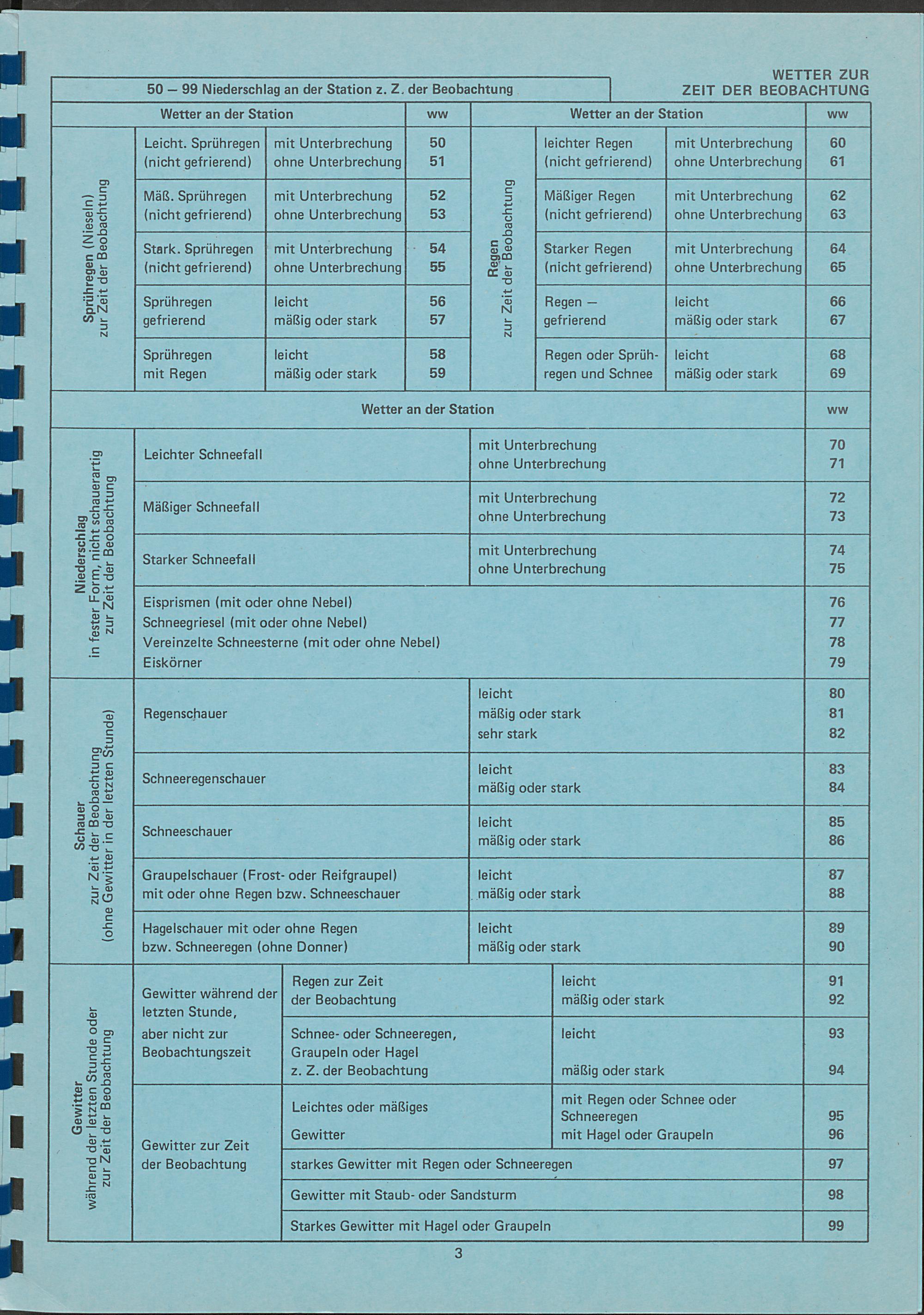 Schlüsseltafel für die Eintragungen der Wetterbeobachtungen auf See