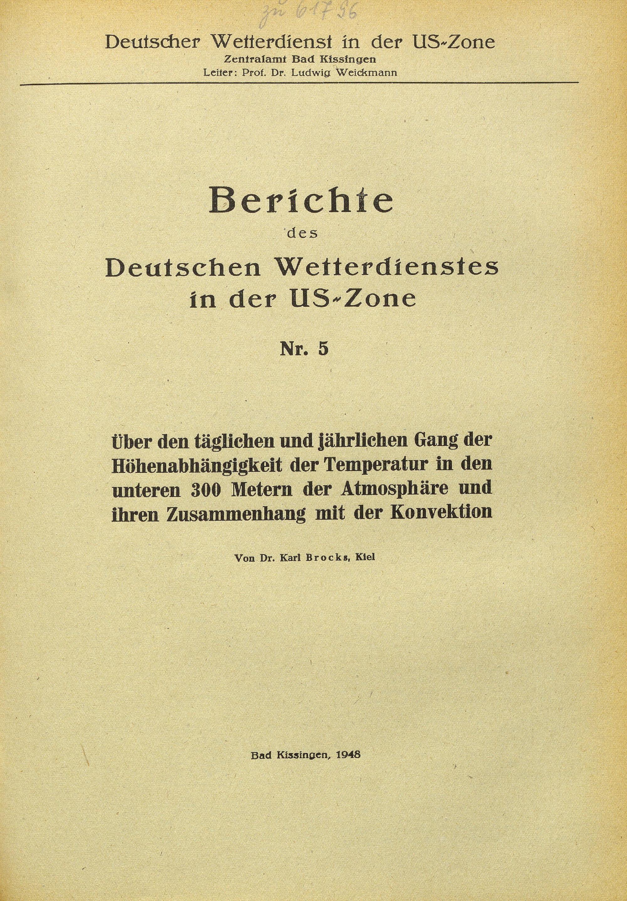 Über den täglichen und jährlichen Gang der Höhenabhängigkeit der Temperatur in den unteren 300 Metern der Atmosphäre und ihren Zusammenhang mit der Konvektion / von Karl Brocks