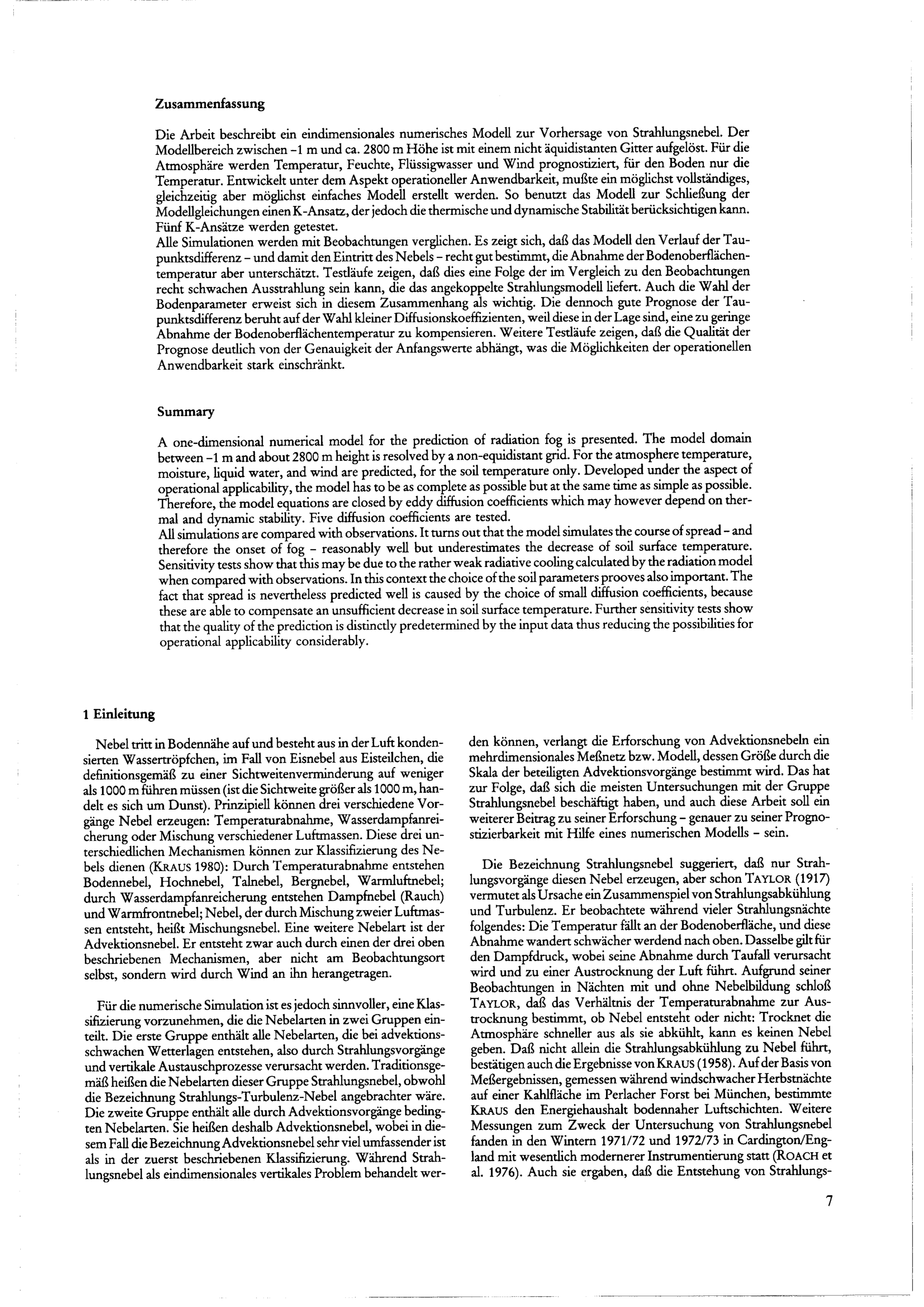 Ein eindimensionales numerisches Modell zur Nebelvorhersage
