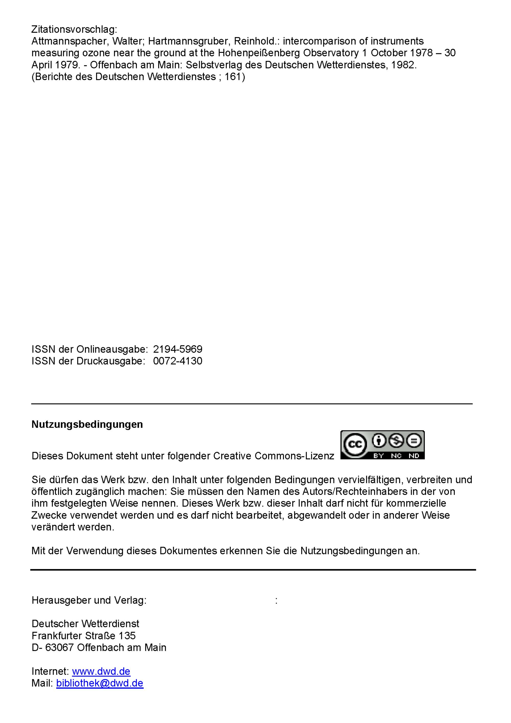 Intercomparison of instruments measuring ozone near the ground at the Hohenpeißenberg Observatory : 1 Oct. 1978 - 30 April 1979 ; with 5 tables in the text and an addendum with 7 tables / by Walter Attmannspacher and Reinhold Hartmannsgruber
