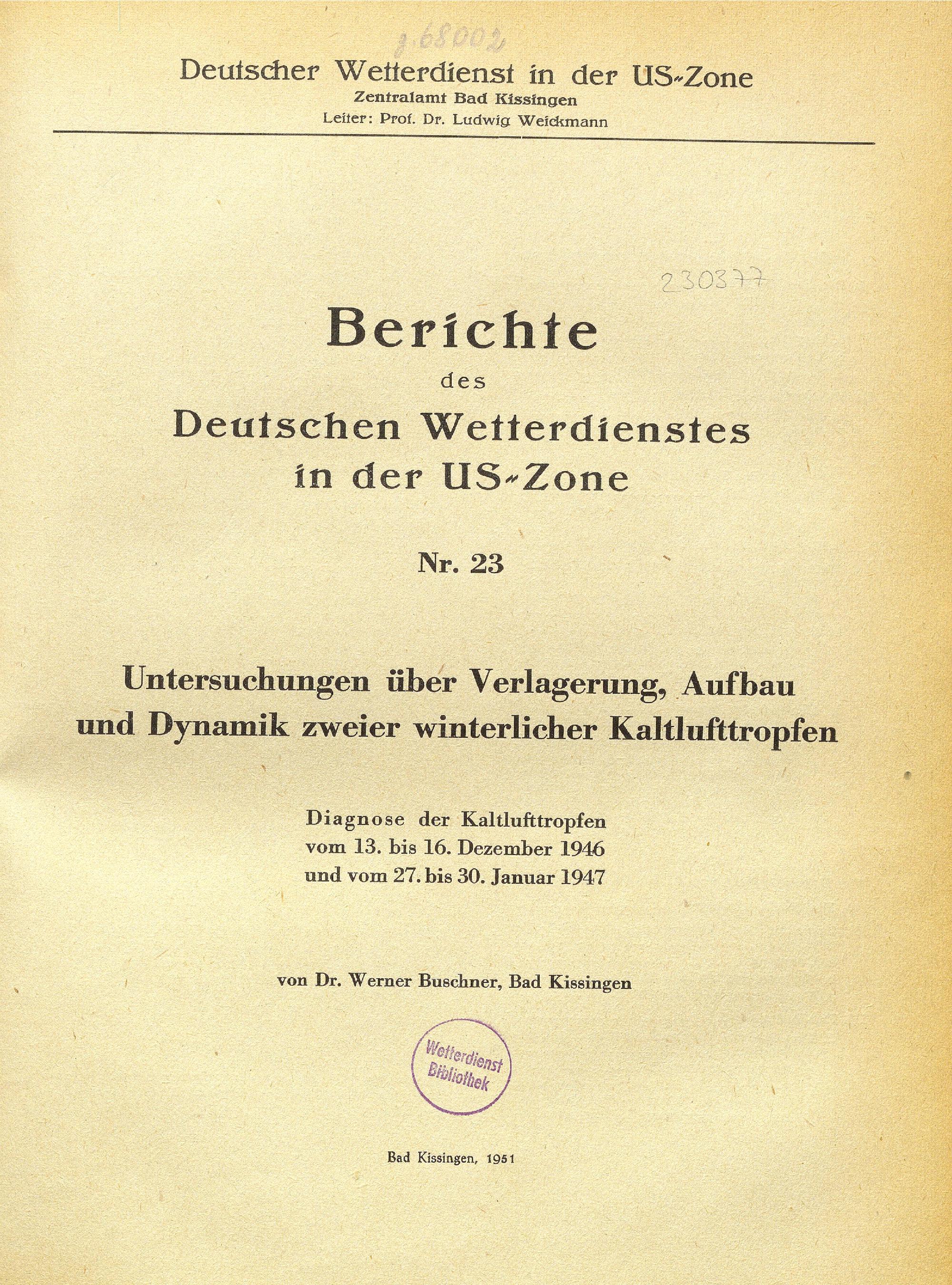 Untersuchungen über Verlagerung, Aufbau und Dynamik zweier winterlicher Kaltlufttropfen : Diagnose der Kaltlufttropfen vom 13. bis 16. Dezember 1946 und vom 27. bis 30. Januar 1947 / von Werner Buschner