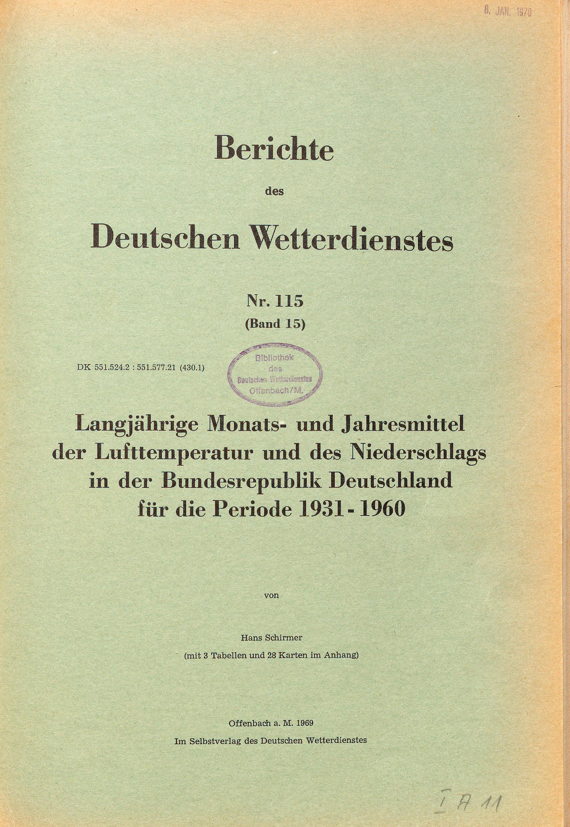 Langjährige Monats- und Jahresmittel der Lufttemperatur und des Niederschlags in der Bundesrepublik Deutschland für die Periode 1931 - 1960 : (mit 3 Tabellen im Anhang) / von Hans Schirmer