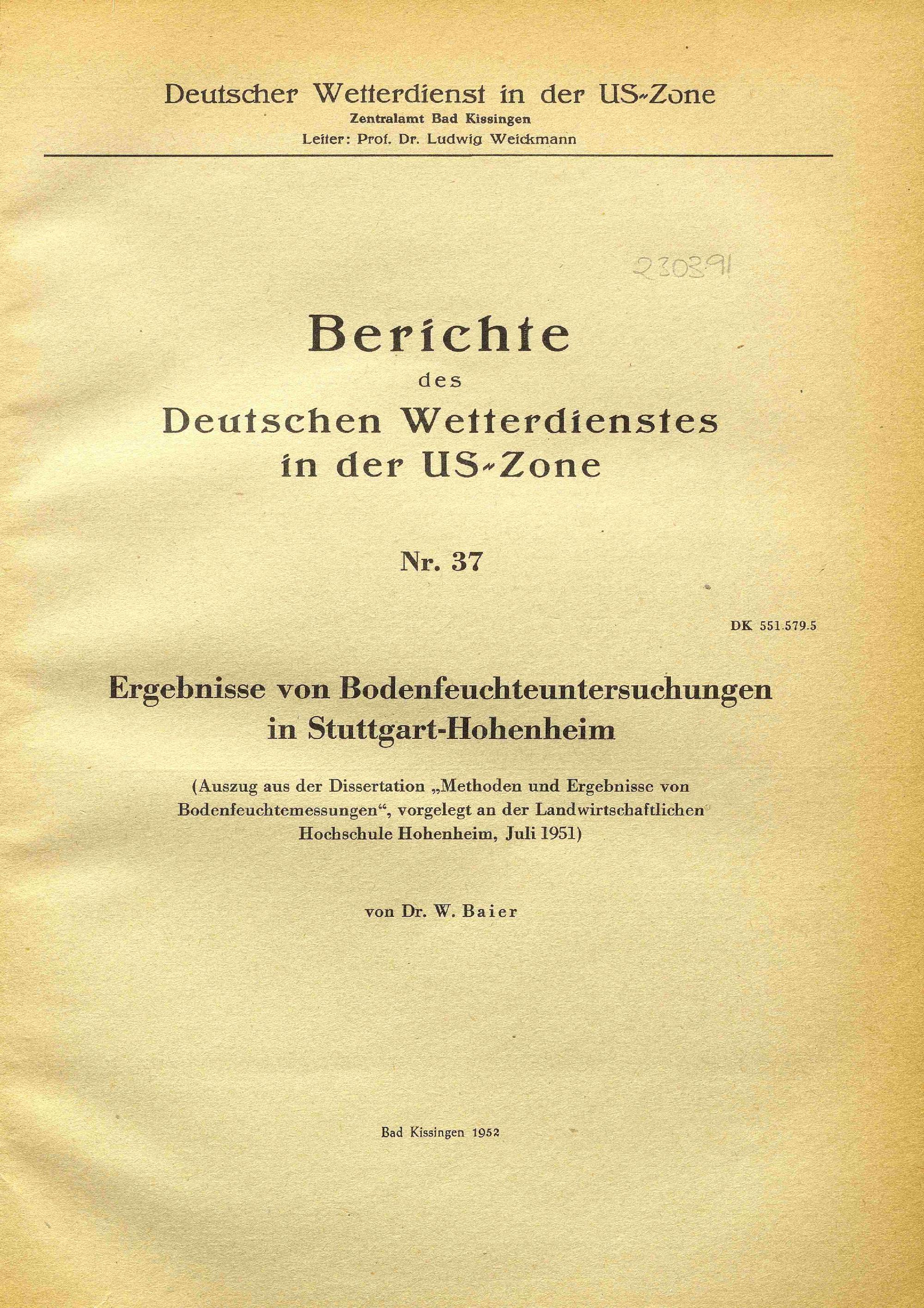 Ergebnisse von Bodenfeuchteuntersuchungen in Stuttgart-Hohenheim / von W. Baier