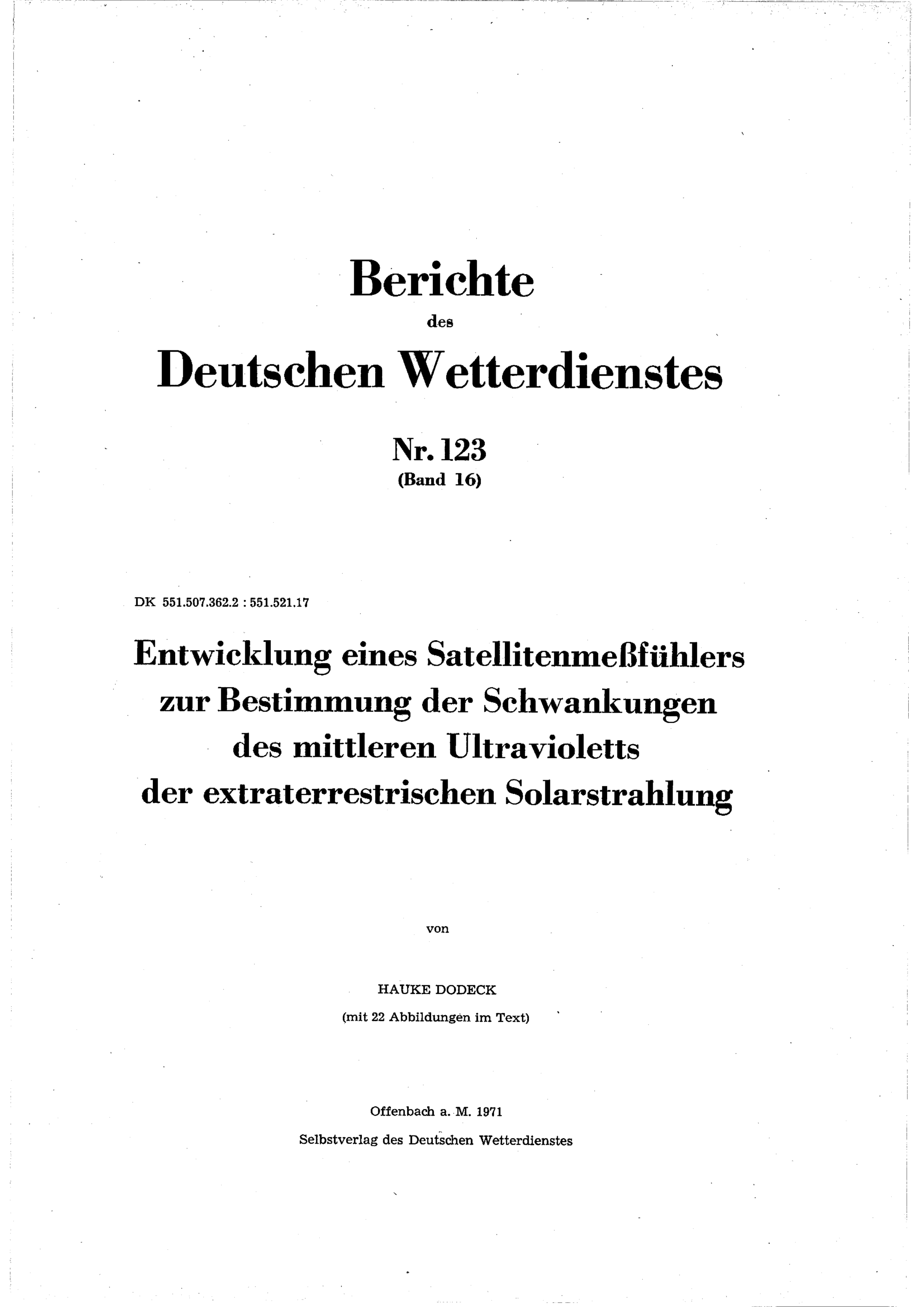 Entwicklung eines Satellitenmeßfühlers zur Bestimmung der Schwankungen des mittleren Ultravioletts der extraterrestrischen Solarstrahlung / von Hauke Dodeck