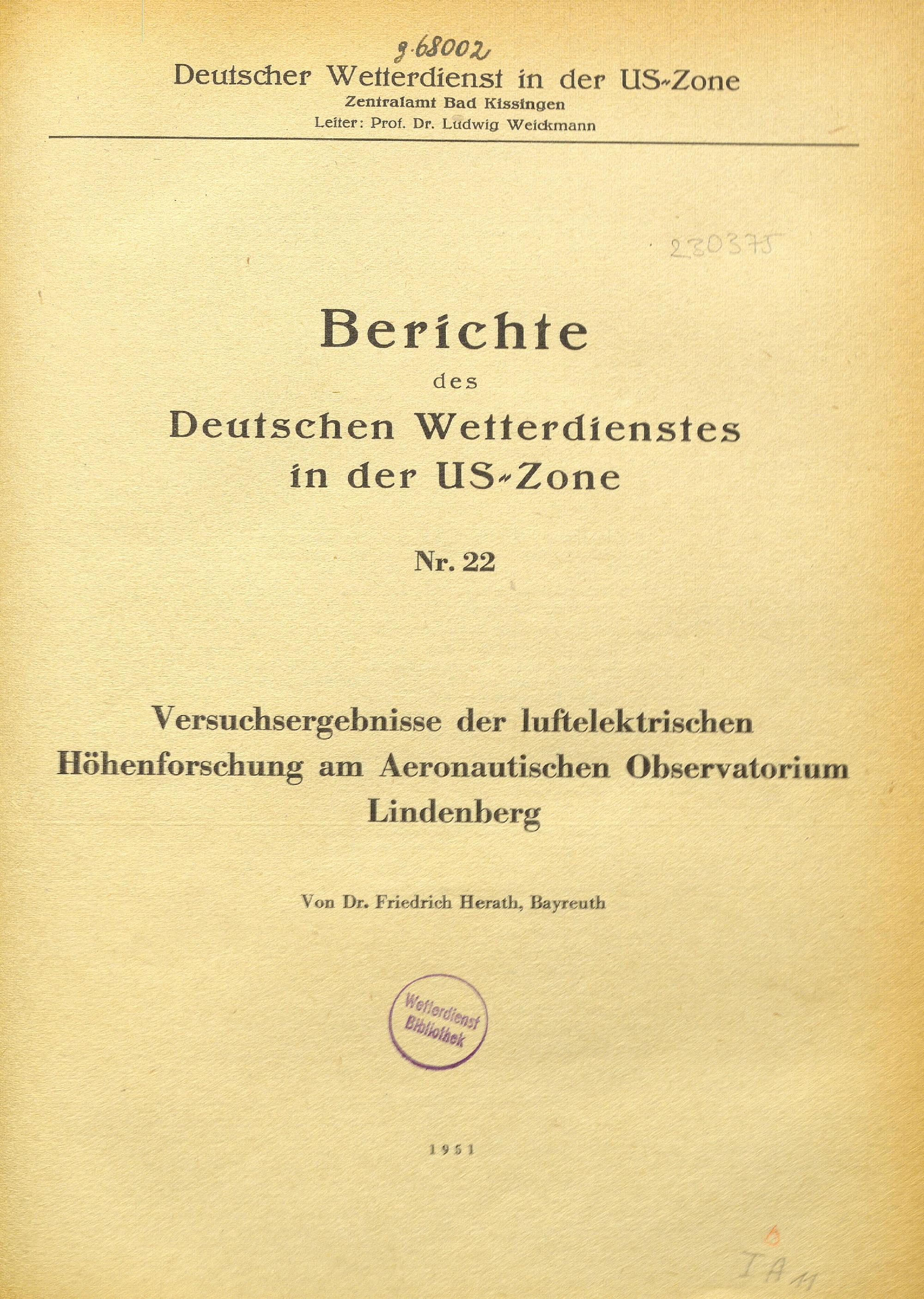 Versuchsergebnisse der luftelektrischen Höhenforschung am Aeronautischen Observatorium Lindenberg / von Friedrich Herath