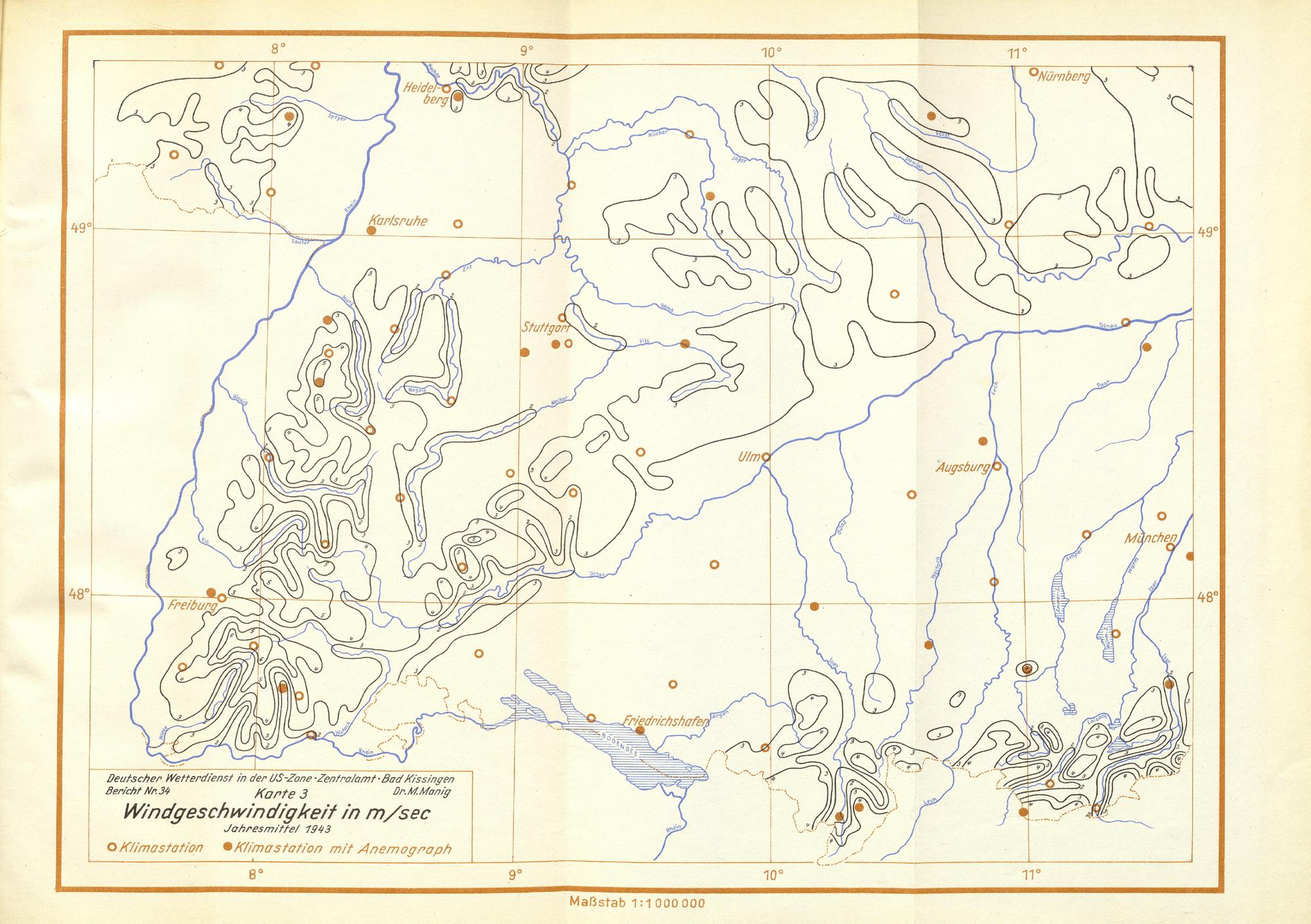 Karte der Windgeschwindigkeit für das westliche Deutschland / von M. Manig