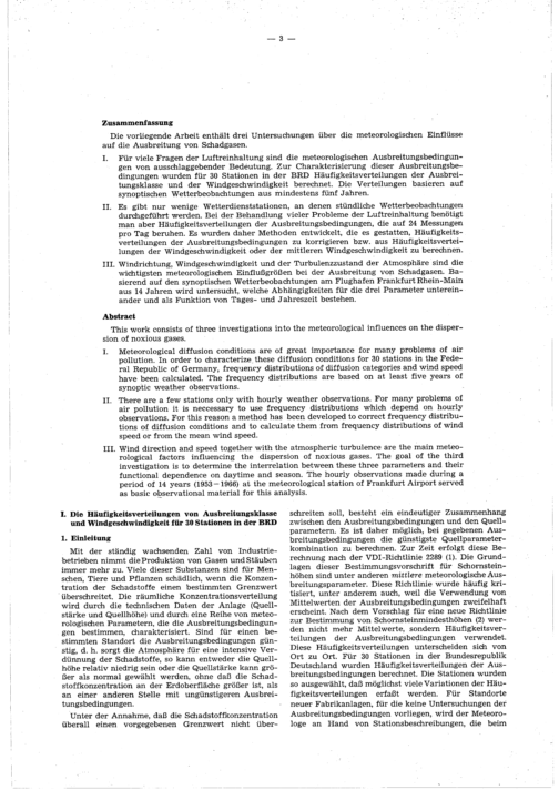 I. Die Häufigkeitsverteilungen von Ausbreitungsklasse und Windgeschwindigkeit für 30 Stationen in der BRD