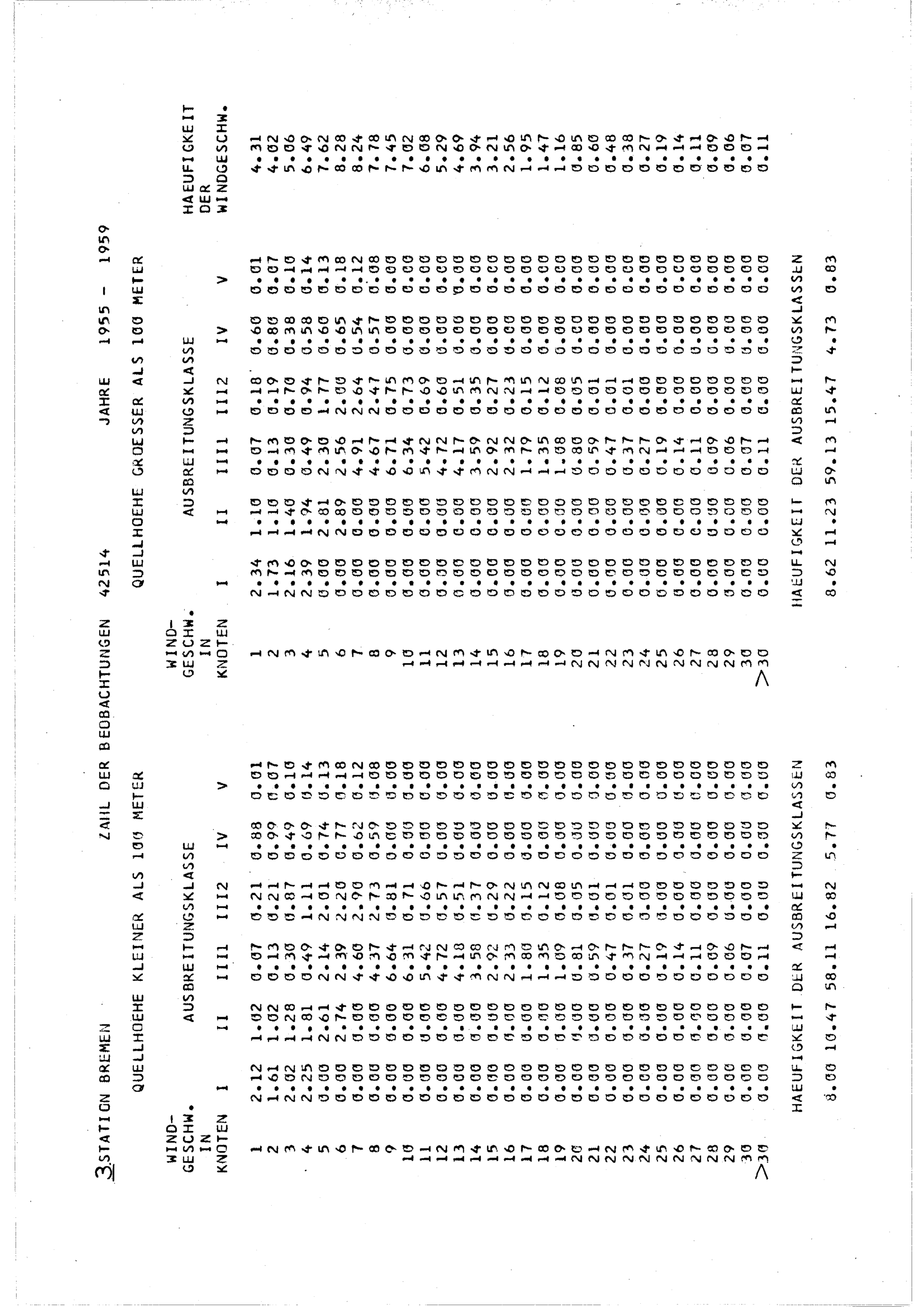 I. Die Häufigkeitsverteilungen von Ausbreitungsklasse und Windgeschwindigkeit für...