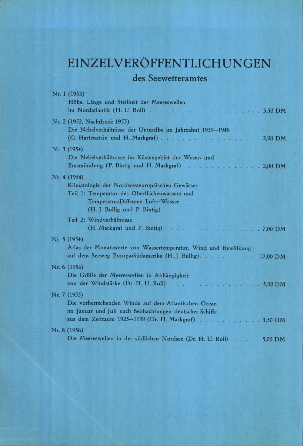 Einzelveröffentichungen des Seewetteramtes Nr. 1 - 8