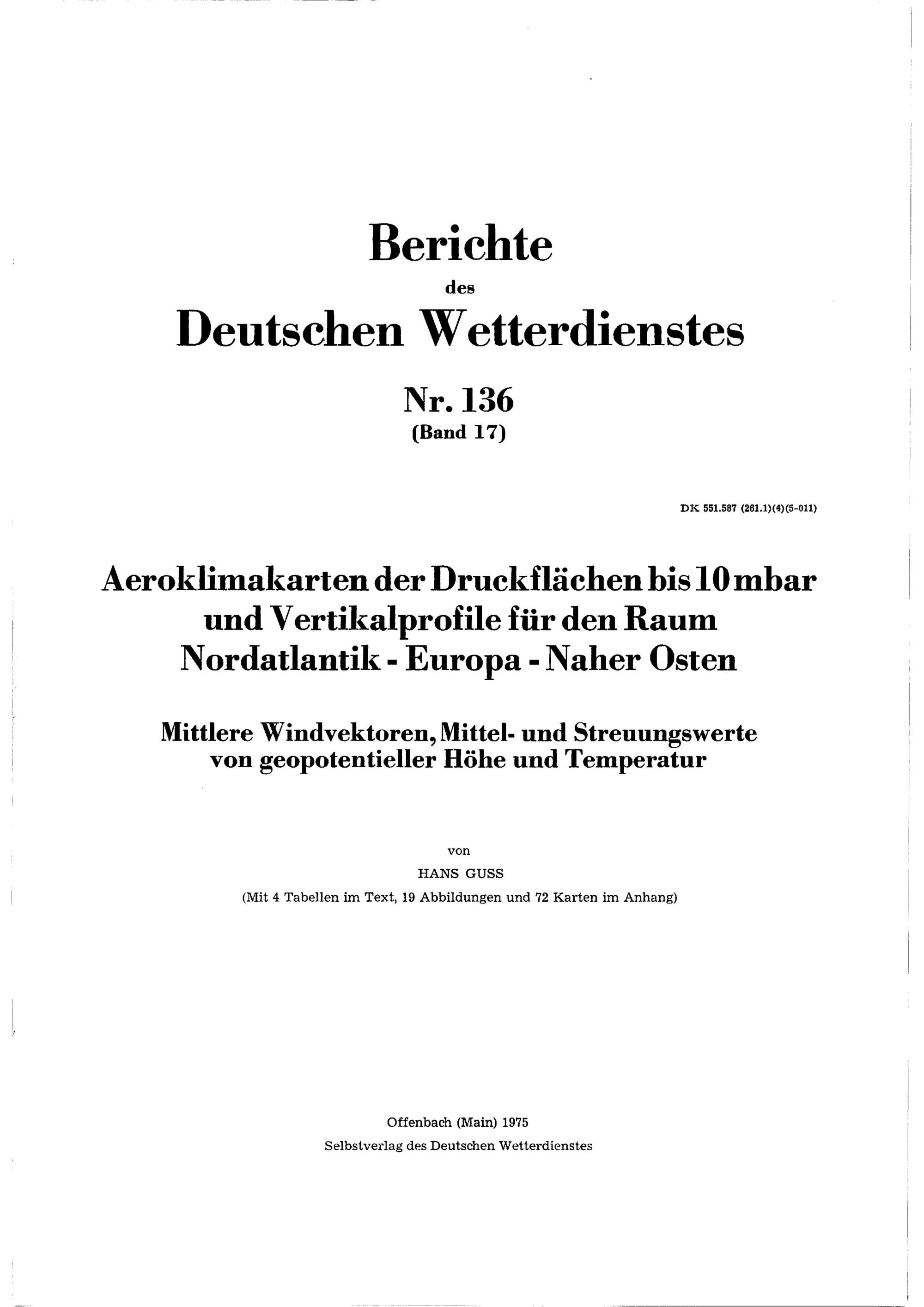 Aeroklimakarten der Druckflächen bis 10-mBar und Vertikalprofile für den Raum Nordatlantik, Europa, Naher Osten : mittlere Windvektoren, Mittel- und Streuungswerte von geopotentieller Höhe und Temperatur / Hans Guss