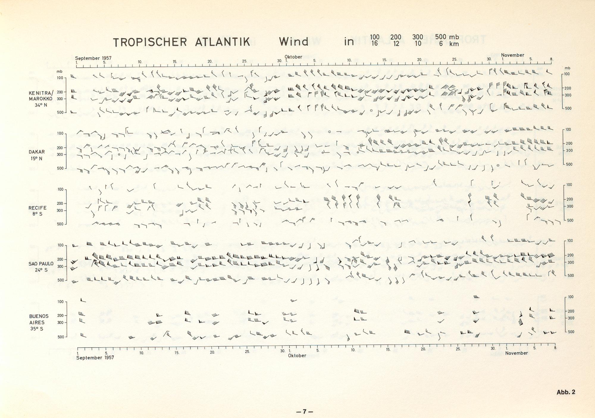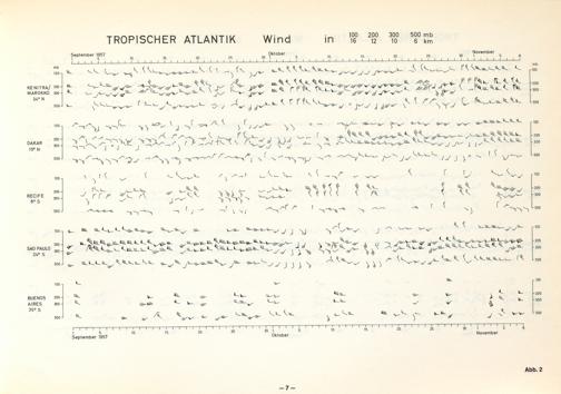 Darstellung ausgewählter täglicher Höhenwinde in den Tropen zwischen 10 und 80 Grad Westlage (Tropischer Atlantik und Westküste Südamerikas) für das Internationale Geophysikalische Jahr 1957/58 sowie für Dakar (Westafrika) 1955 - 1963 / Willy Rudloff