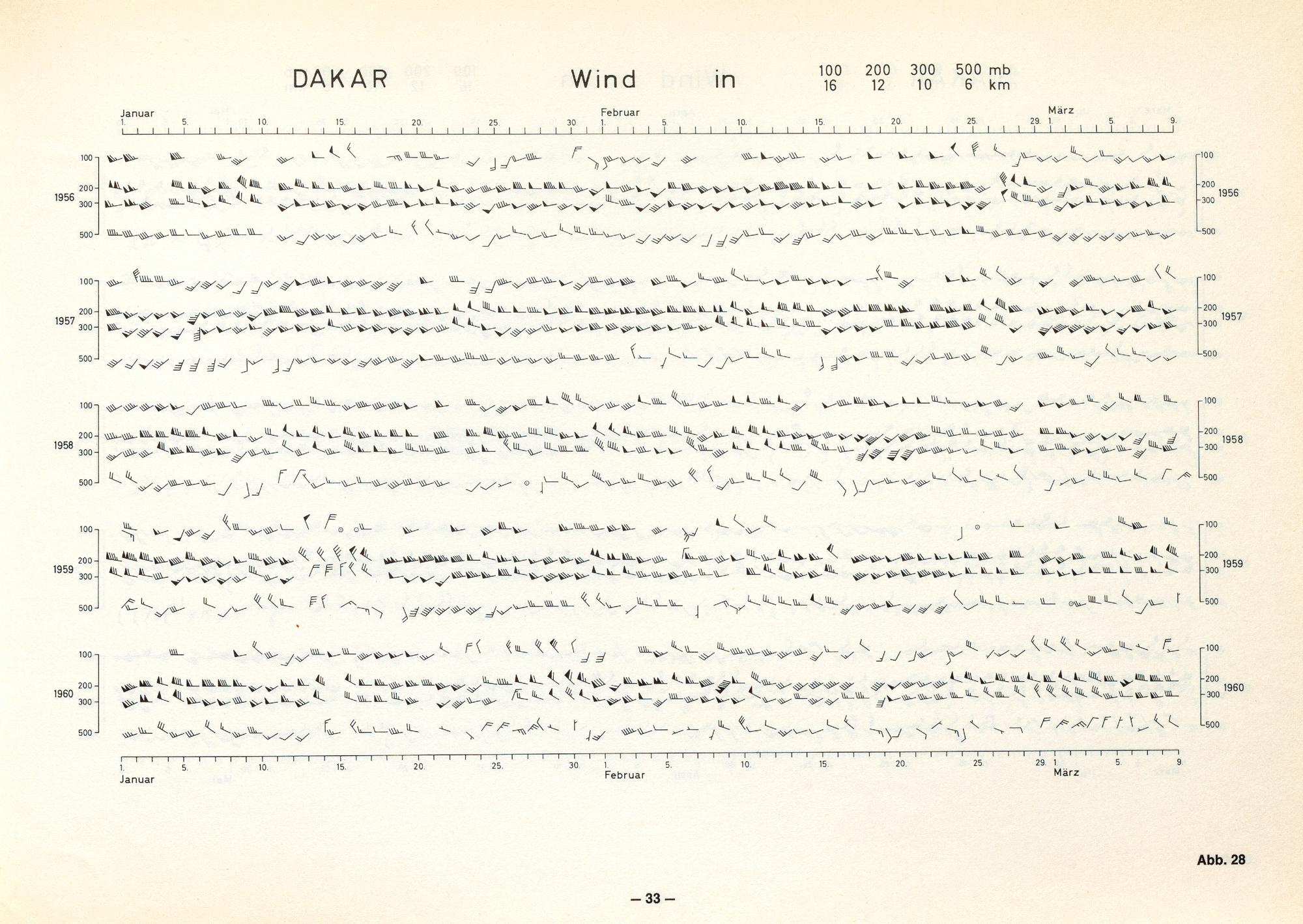 Darstellung ausgewählter täglicher Höhenwinde in den Tropen zwischen 10 und 80 Grad Westlage (Tropischer Atlantik und Westküste Südamerikas) für das Internationale Geophysikalische Jahr 1957/58 sowie für Dakar (Westafrika) 1955 - 1963 / Willy Rudloff