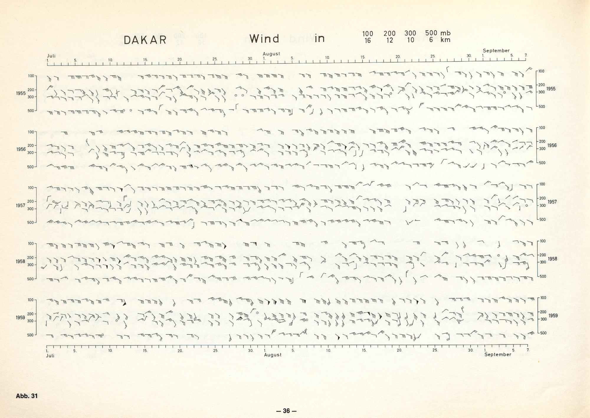 Darstellung ausgewählter täglicher Höhenwinde in den Tropen zwischen 10 und 80 Grad Westlage (Tropischer Atlantik und Westküste Südamerikas) für das Internationale Geophysikalische Jahr 1957/58 sowie für Dakar (Westafrika) 1955 - 1963 / Willy Rudloff