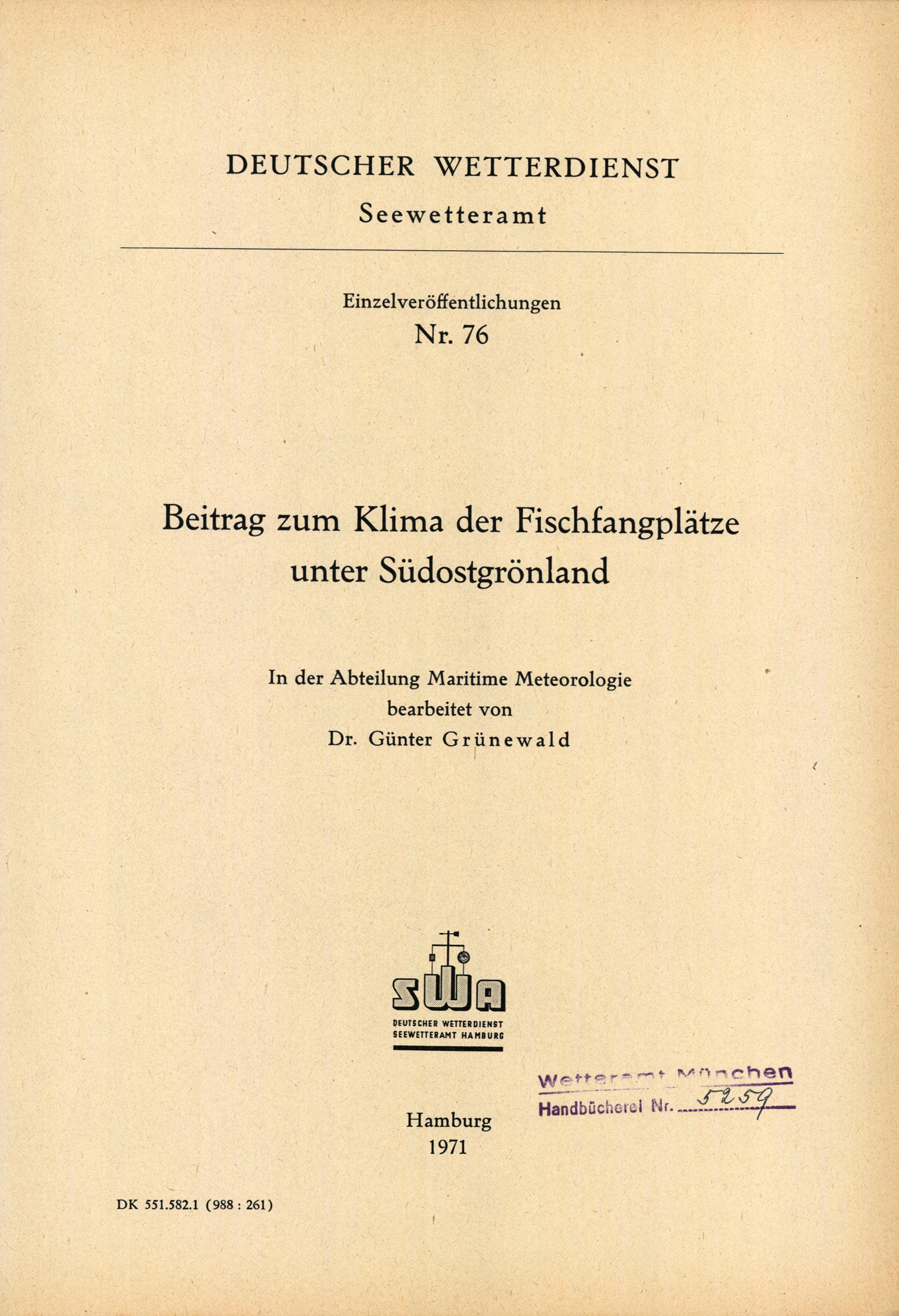 Beitrag zum Klima der Fischfangplätze unter Südgrönland / Günter Grünewald