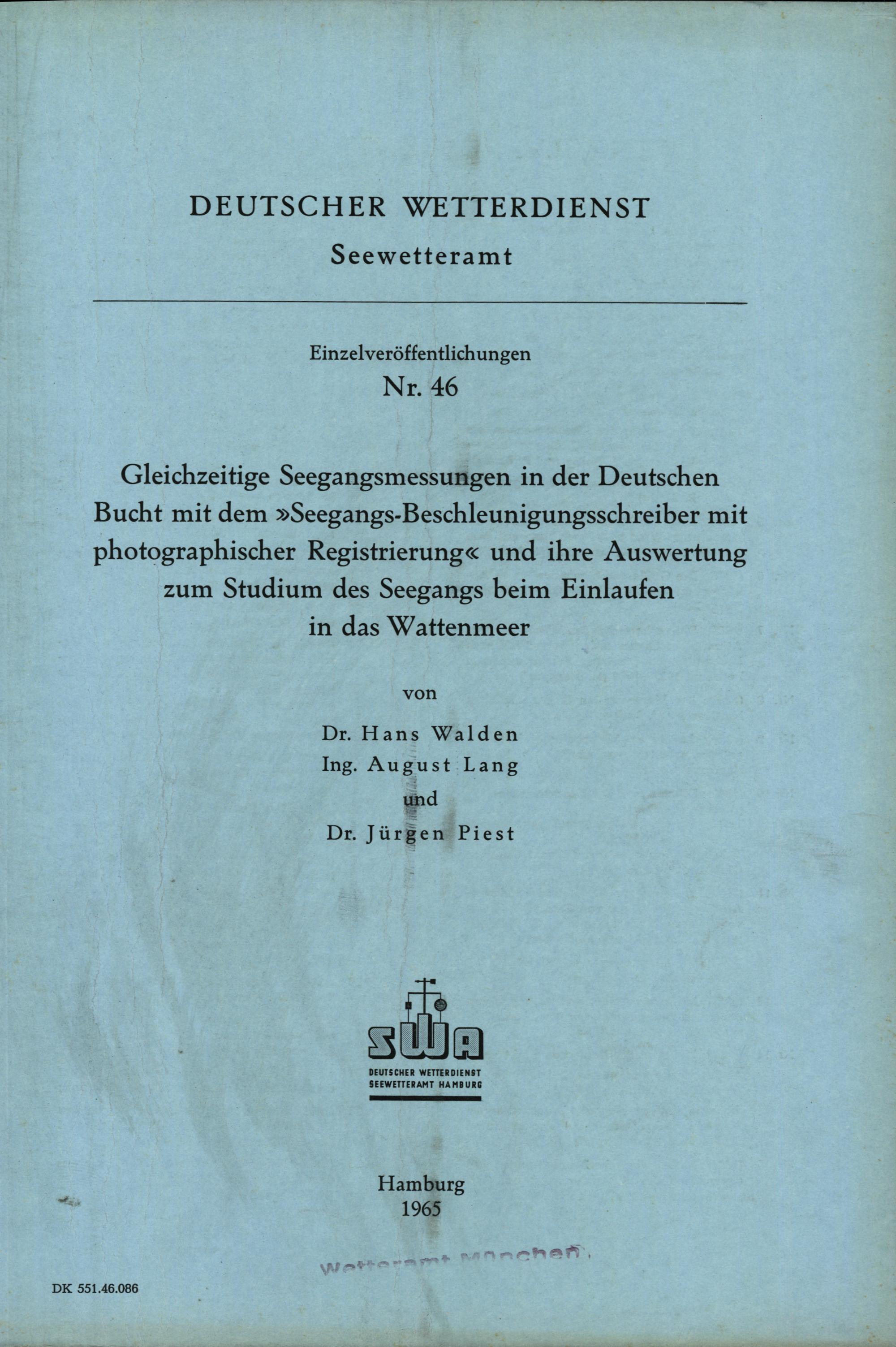 Gleichzeitige Seegangsmeldungen in der Deutschen Bucht mit dem "Seegangs-Beschleunigungsschreiber mit photographischer Registrierung" und ihre Auswertung zum Studium des Seegangs beim Einlaufen in das Wattenmeer / von Hans Walden, August Lang und Jürgen Piest