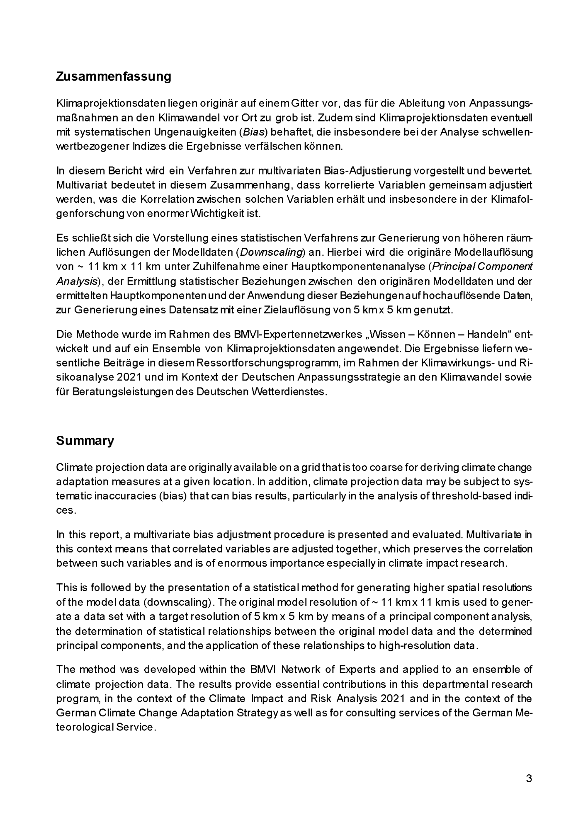 Statistische Aufbereitung von Klimaprojektionen: Downscaling und multivariate Bias-Adjustierung : im Rahmen des BMVI-Expertennetzwerkes entwickelte Verfahren zum Postprocessing von Klimamodelldaten / von Stefan Krähenmann, Andreas Walter und Lara Klippel ; Fachliche Durchsicht: Dr. Michael Denhard (DWD) ; Herausgeber und Verlag: Deutscher Wetterdienst